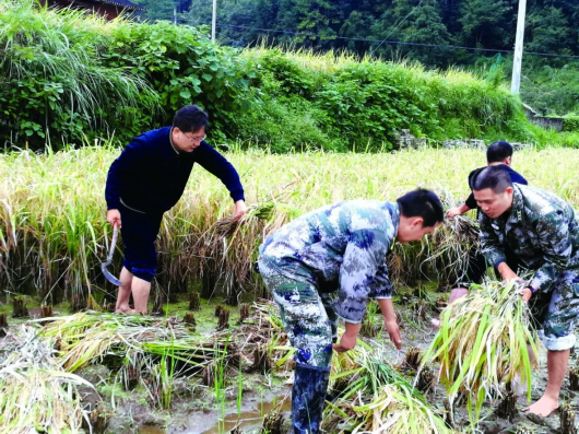 审计署派驻丹寨县扶贫干部(左一)为丹寨县交圭村缺乏劳动力的建档立卡贫困户抢收稻谷