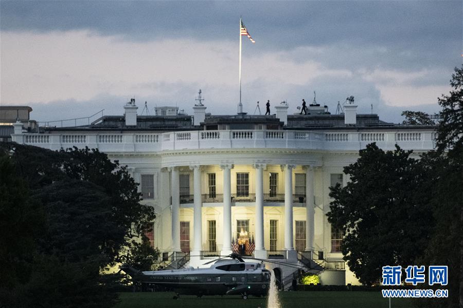 10月5日,在美国华盛顿,搭载美国总统特朗普的直升机飞抵白宫。 正在接受新冠治疗的美国总统特朗普于美国东部时间5日傍晚出院返回白宫,但其医疗团队说,特朗普还未痊愈。 新华社记者 刘杰 摄