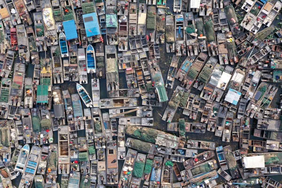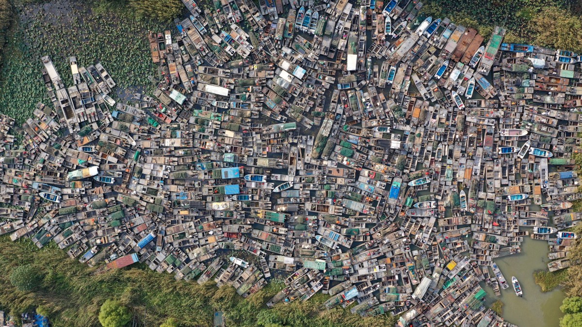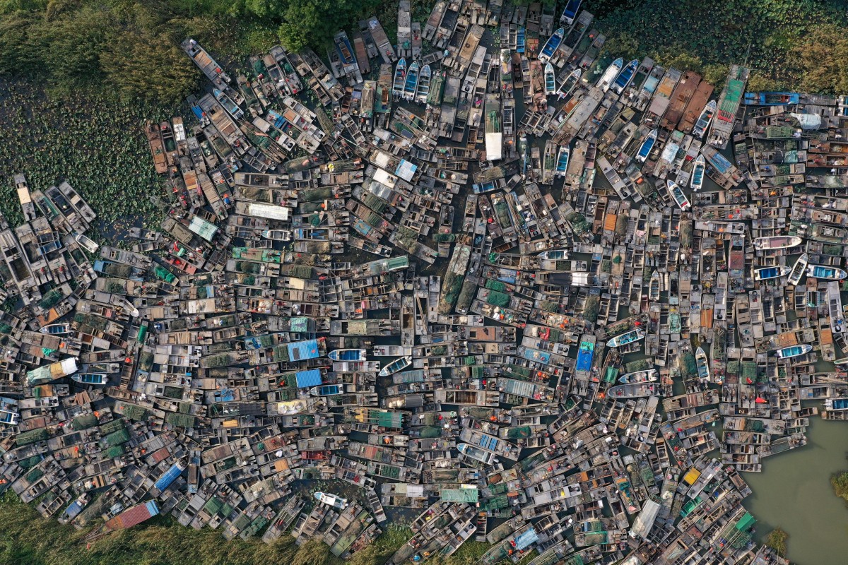2020年10月17日,江苏淮安市洪泽区将要拆解的渔船,密密匝匝。