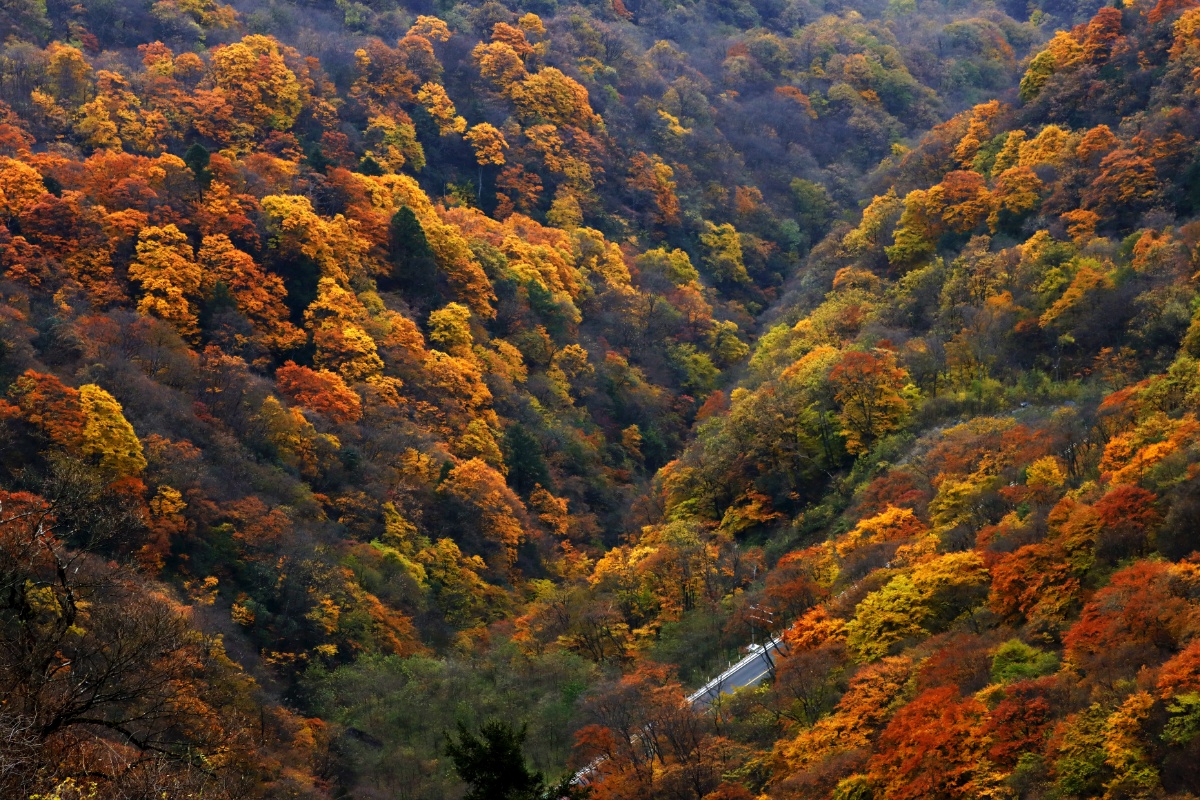 湖北神农架漫山遍野各色树叶五彩斑斓,美不胜收。