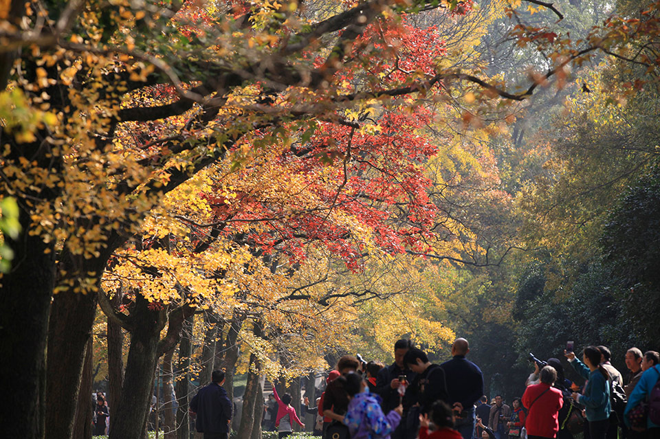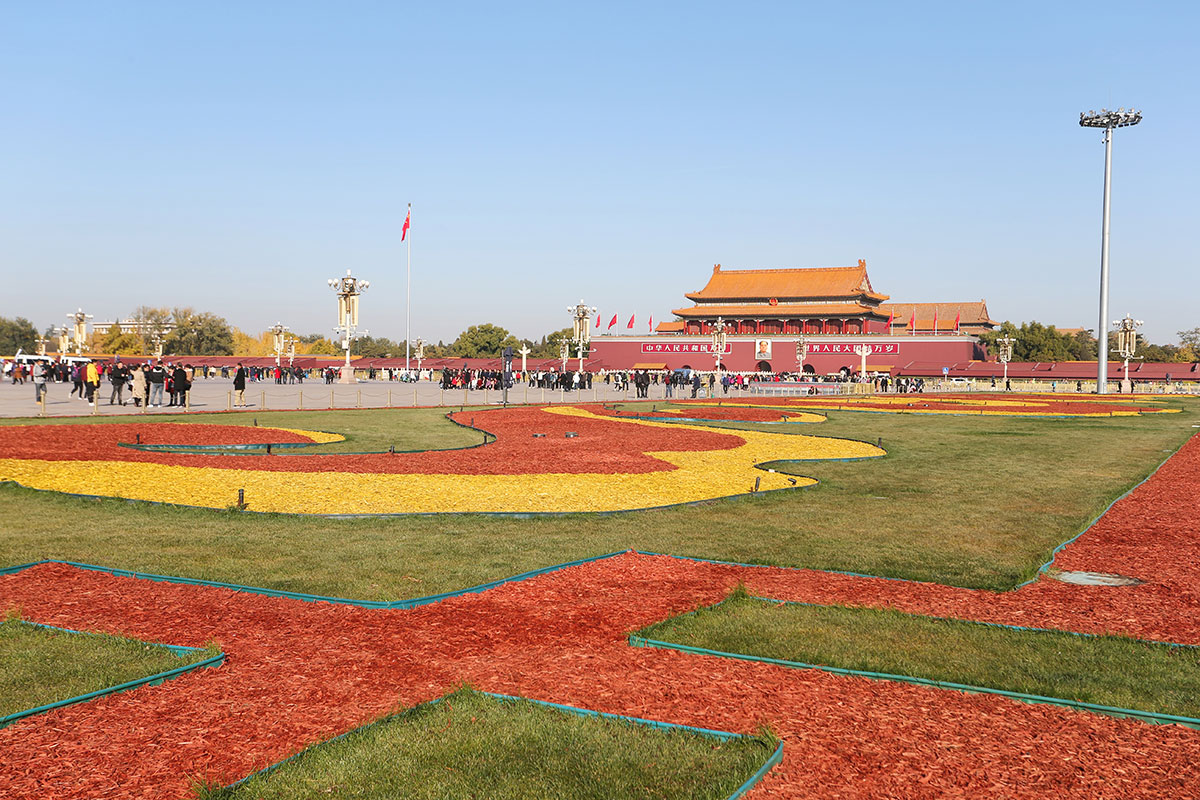 2020年11月10日,北京,天安门广场东侧绿地的冬季景观亮相。绿地仍延续之前的吉祥如意花带布置方式,不过,花带中的地被花卉被替换成了染成棕红色和黄色的木质覆盖物。这是天安门广场绿地首次扮上“彩妆”过冬。