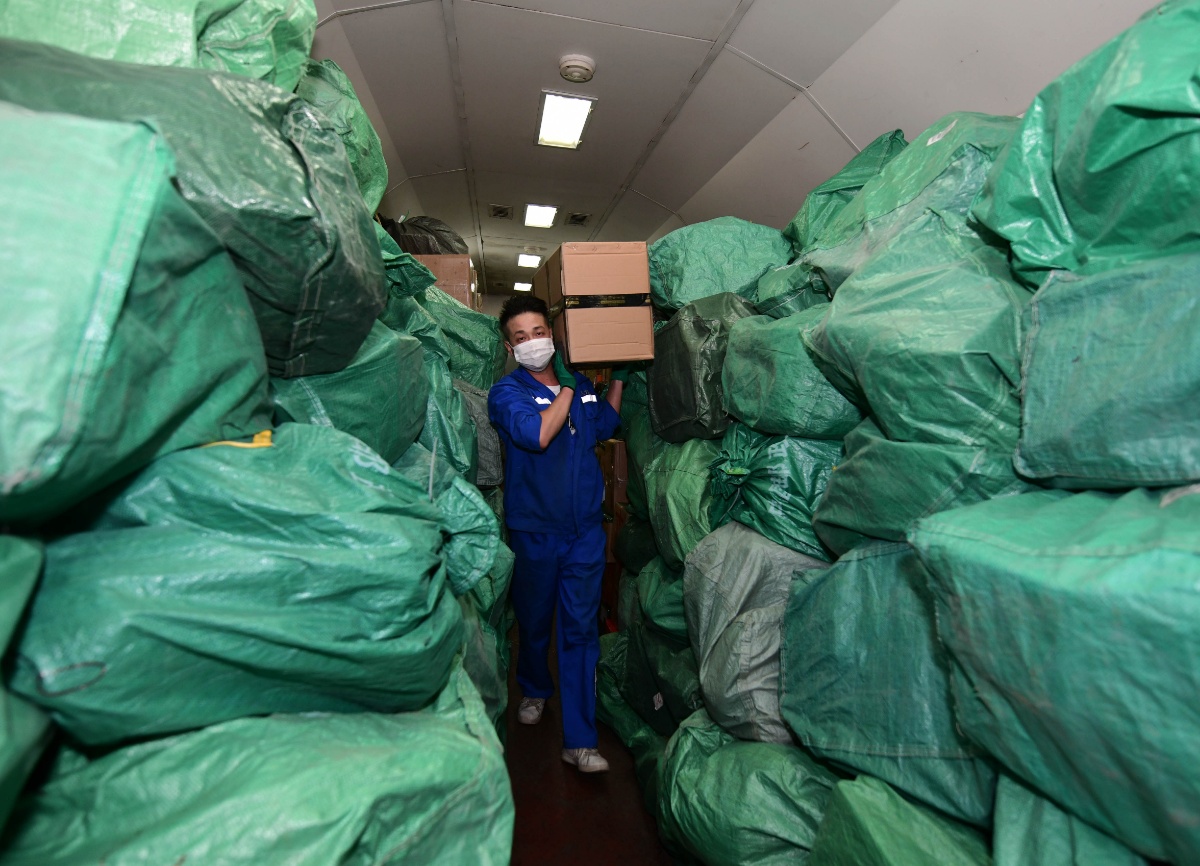 2020年11月10日晚,在南昌车站,工作人员正在将“双11”电商快件装运至T168次列车上。