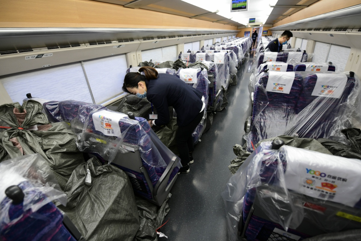 2020年11月10日,在南昌车站,工作人员正在将电商快件搬至动车组上。
