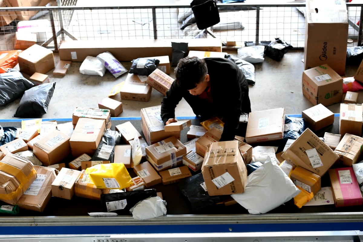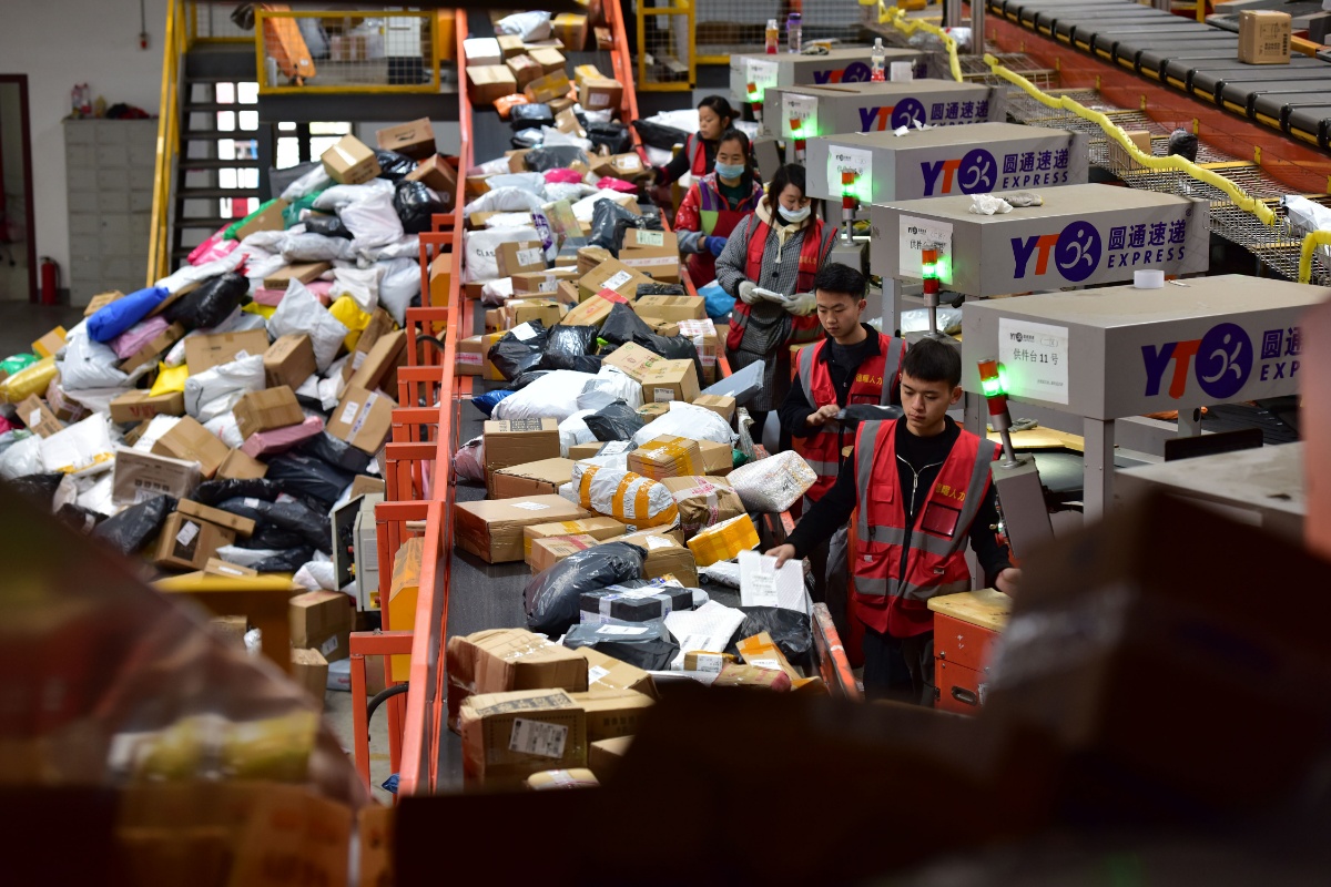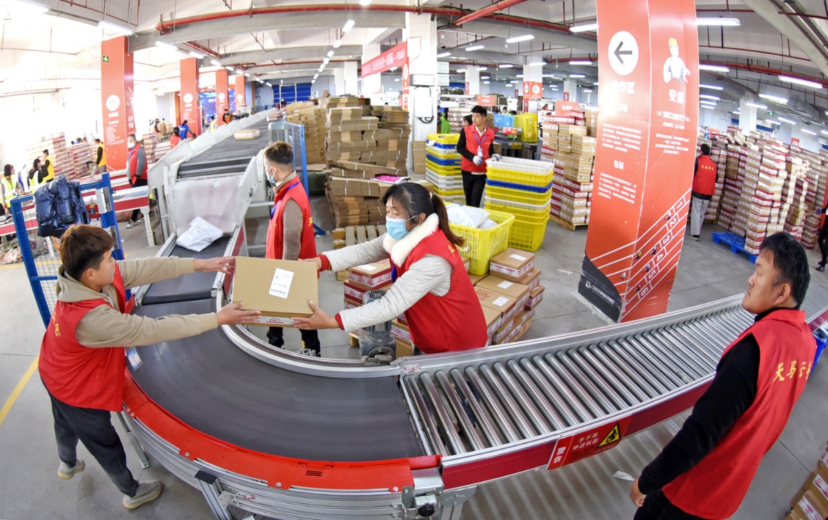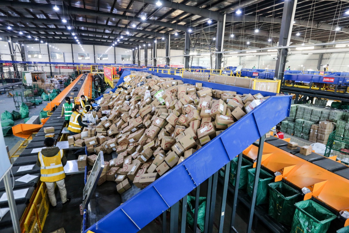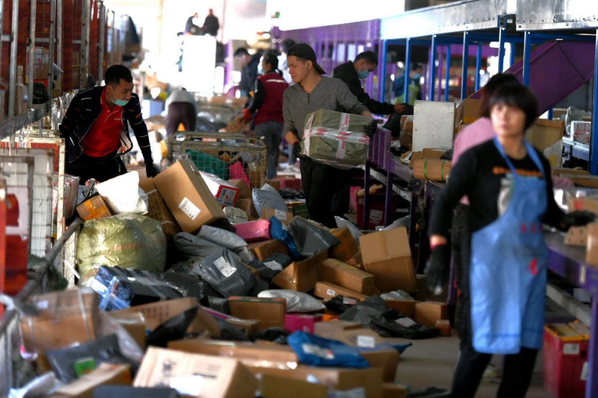 2020年11月11日,江苏淮安,市邮政速递物流公司的工作人员正在分发快件,据介绍,当日快递量为平时的5倍以上,双11当日17点以后将迎来首个快递高峰,一直将持续到20日左右。
