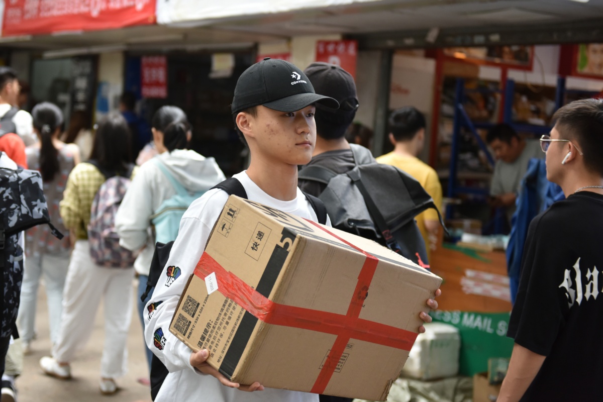 2020年11月11日,海南海口,海南大学快递服务点,学生们在快递站点排队取快递。