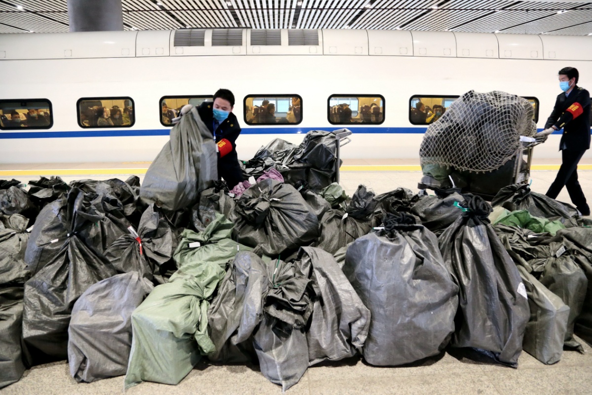 2020年11月11日,工作人员在站台上整理即将运输的包裹,共计1500件的包裹将“搭乘”这趟G838次高铁列车,从西安北运往广州南。今年铁路“双11”电商黄金周运输自11月1日开始,持续至11月20日,较往年运输时间延长10天。电商黄金周运输期间,西安铁路局预计将发送高铁快运货物11.4万件,发送货物量较平时增长60%以上。