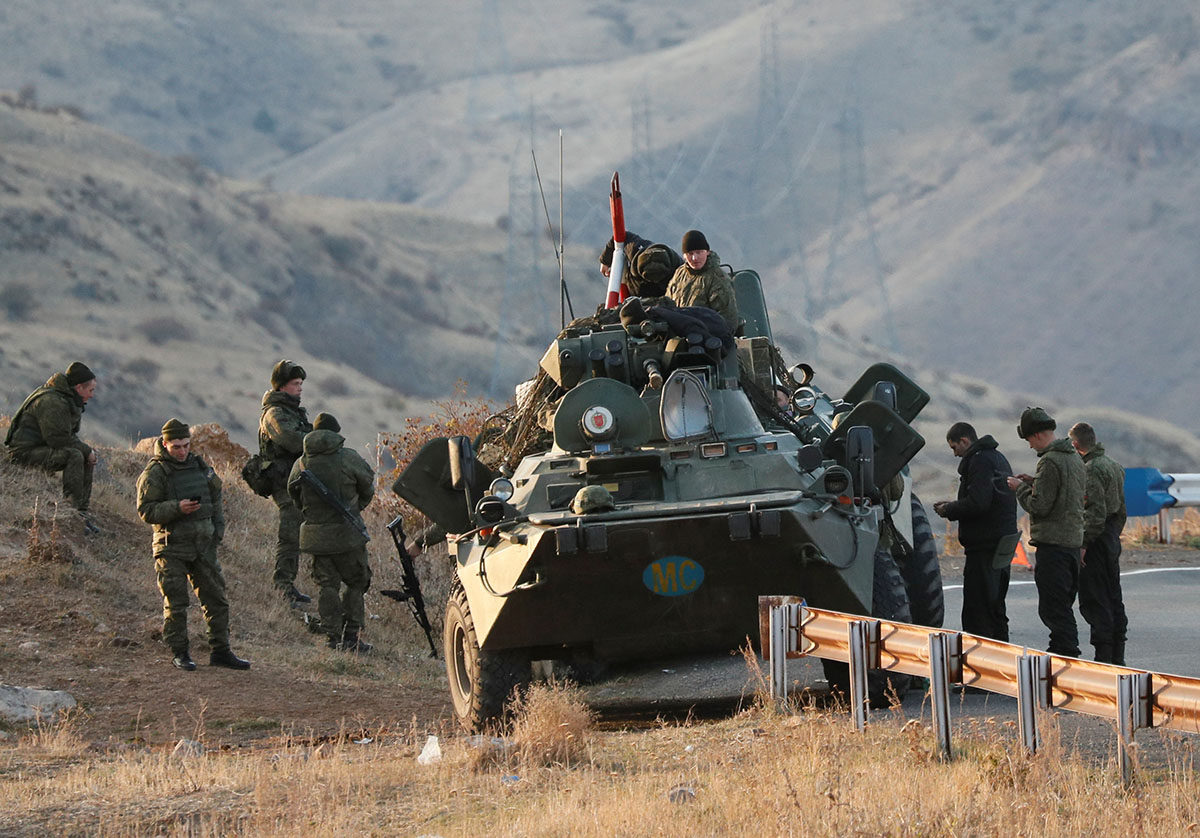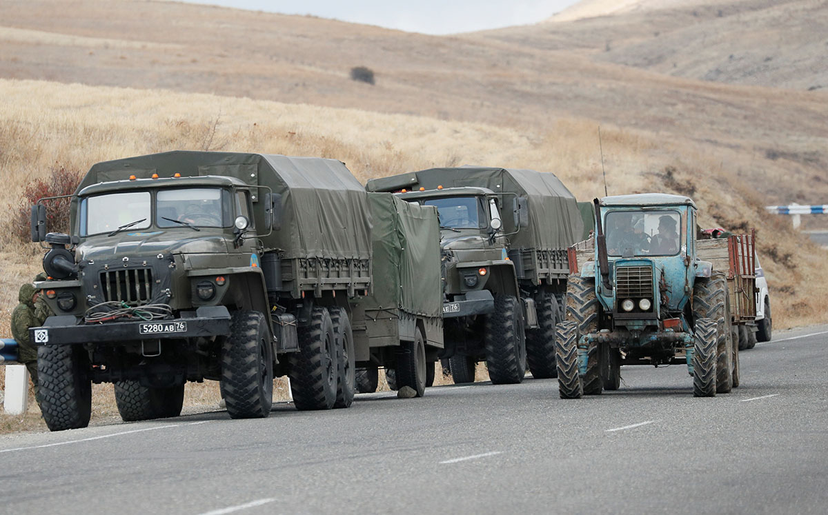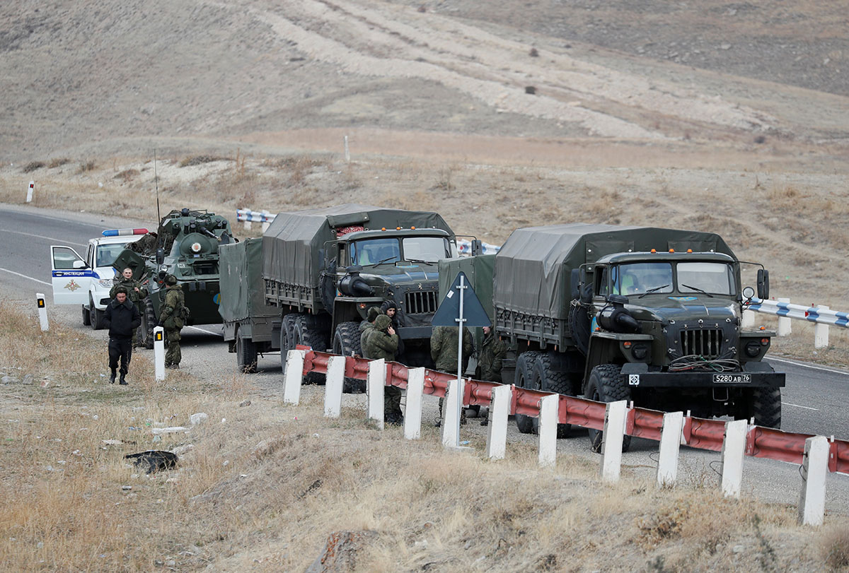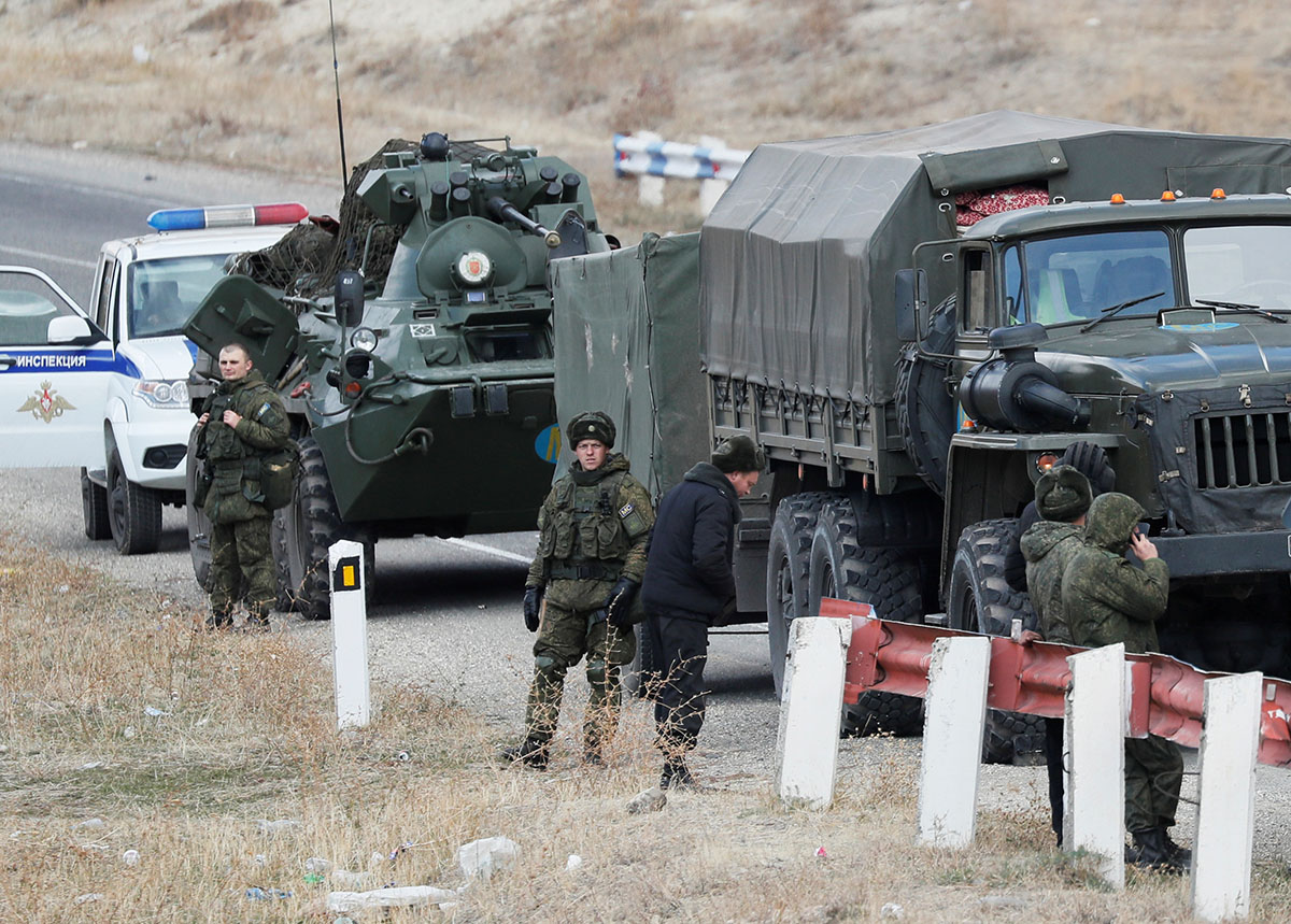 当地时间2020年11月12日,亚美尼亚Goris,进入亚美尼亚的俄军维和人员和军车。