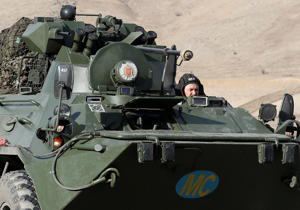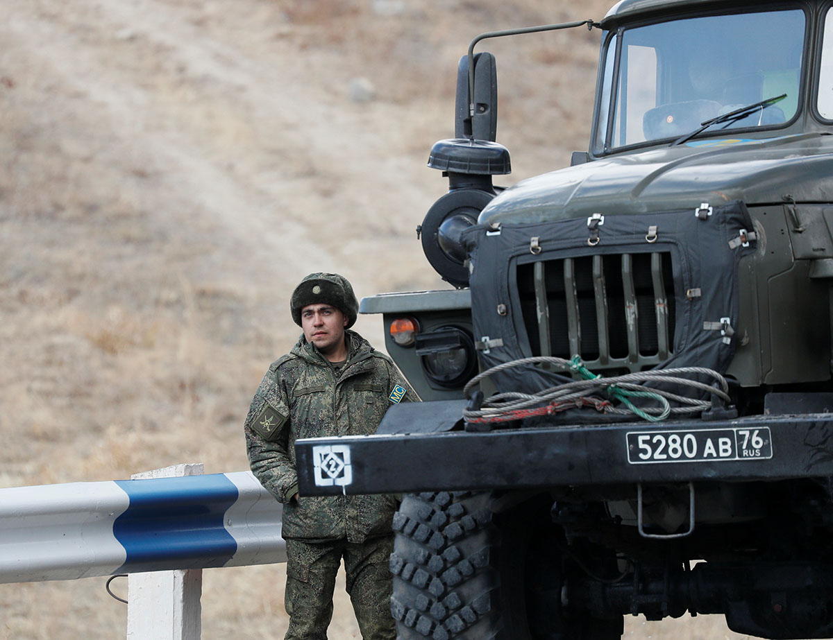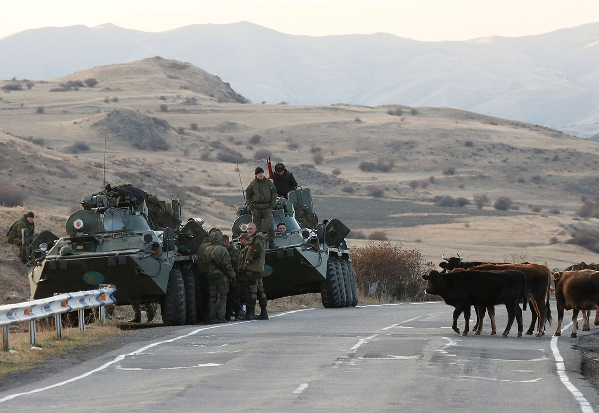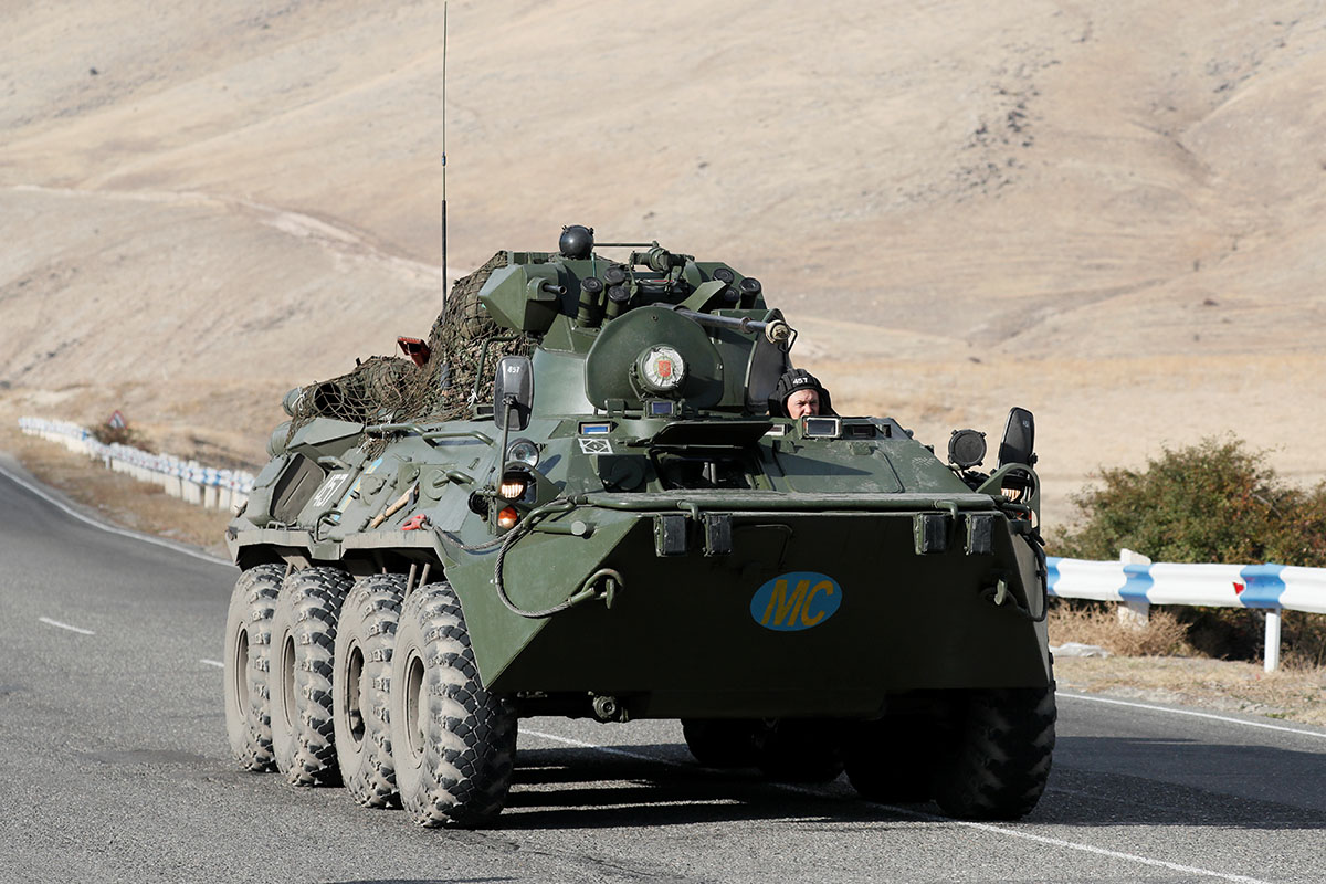 当地时间2020年11月12日,亚美尼亚Goris,进入亚美尼亚的俄军维和人员和军车。