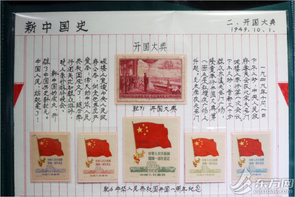 周光复集邮60多年了,他收集的最早的新票,是一张1949年10月新中国成立时,毛主席在开国大典上的邮票。为了能让观众更好地了解这张邮票的诞生背景,任达侯老人工工整整地手写了文字说明。