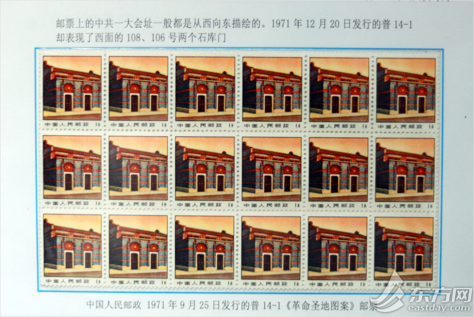 中国邮政在1971年9月25日发行的《革命圣地图案》邮票。一般而言,邮票上的中共一大会址通常都是从西向东描绘的,而这套邮票却表现了西面的108、106号两个石库门。