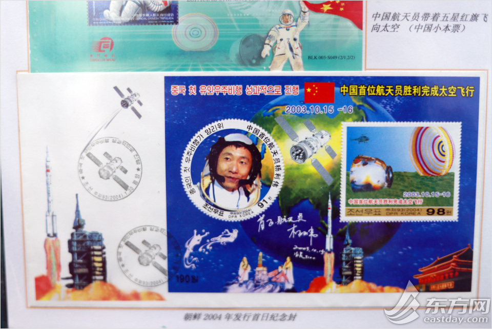 中国航天员杨利伟首次顺利完成太空飞行,朝鲜在2004年发行了首日纪念封。