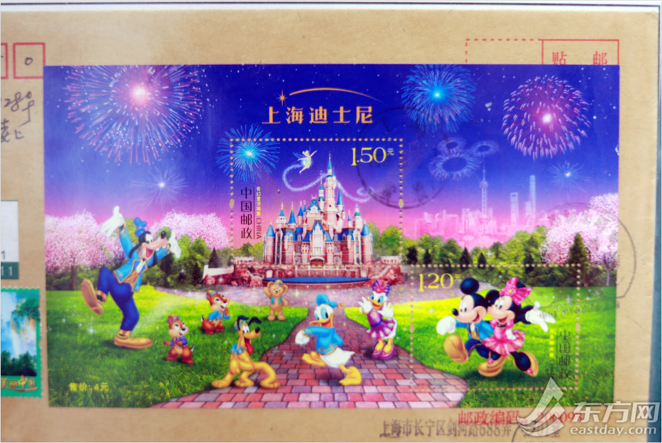由马立航设计的《上海迪士尼》小型张首日挂号实寄封。周光复笑着说,自己还从没去过上海迪士尼呢。
