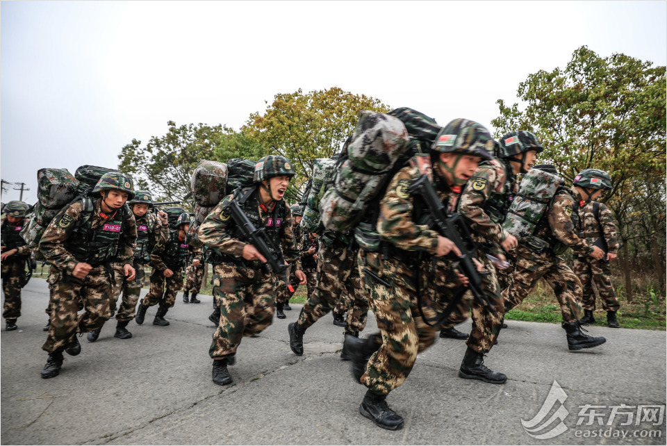 按照20%体能、20%技能、40%战术、10%心理、10%智能的比例,共设置6大类42个课目。图为特战队员进行武装奔袭。