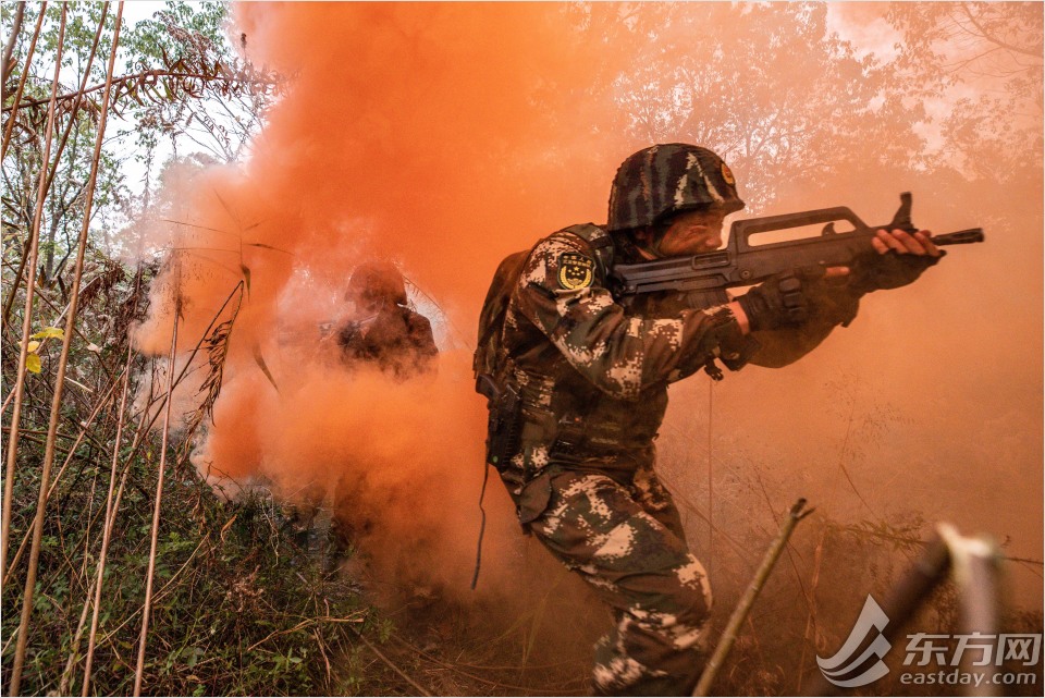 图为特战队员在迷雾封锁中搜索前进。