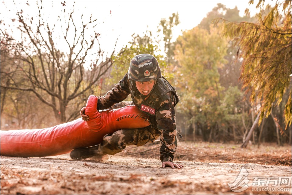 近日,武警上海总队机动一支队特战队员们在野外陌生地域开展“魔鬼周”极限训练。图为特战队员进行从林地捕歼战斗训练。