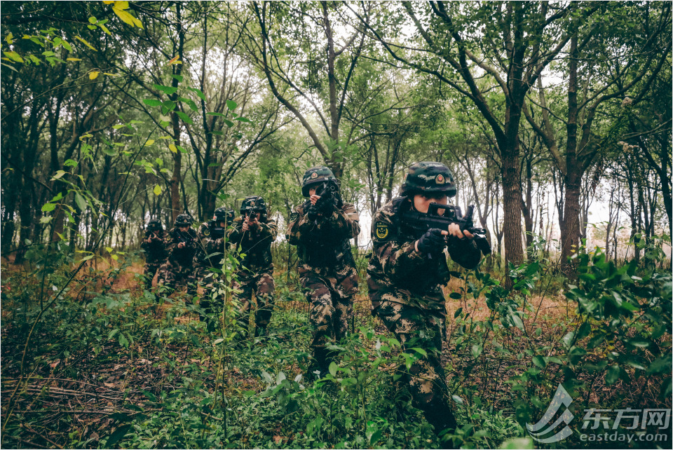 据悉,此次极限训练该支队针对上海大都市城郊战术背景,重点突破城区、居民区、从林地、江都海岸、旅游景点等地形条件下行军、搜索、追击、捕歼、围剿、突击、反劫持战术等难题,全面提高部队反恐实战能力。图为特战队员进行从林地捕歼战斗训练。