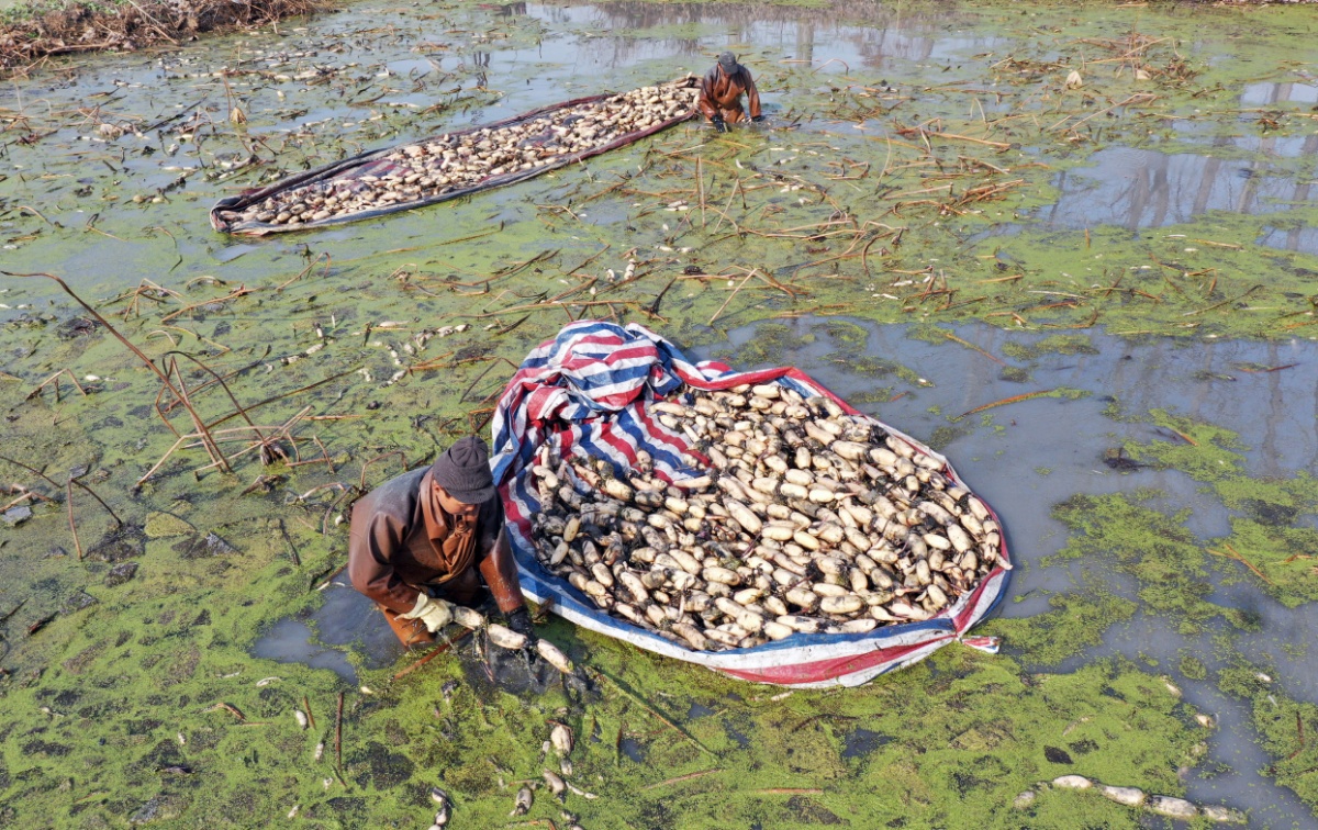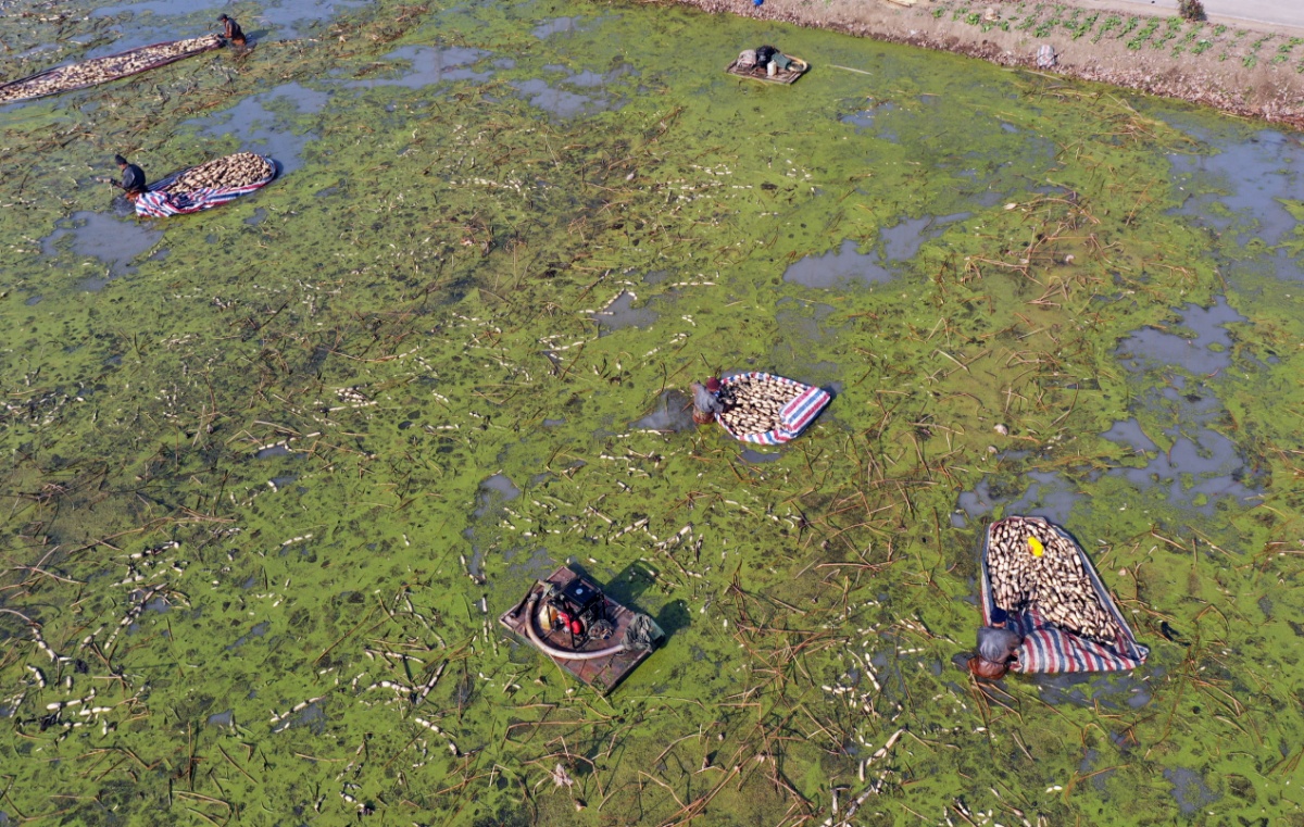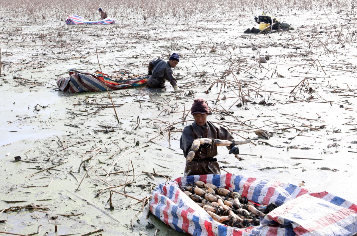 寒冬时节,在江苏省扬州市宝应县万亩荷藕进入收获期,当地农民忙着进行采藕、挑拣,水田中一派丰收的忙碌景象。