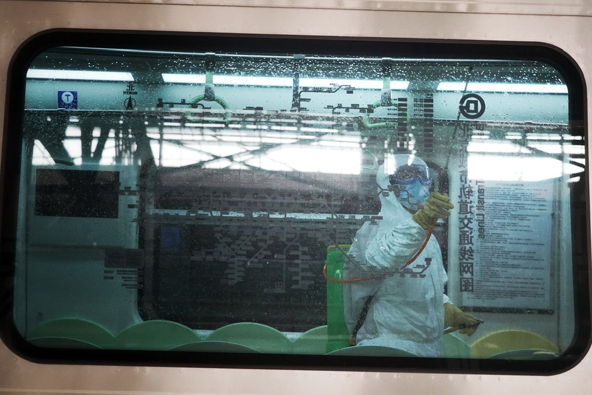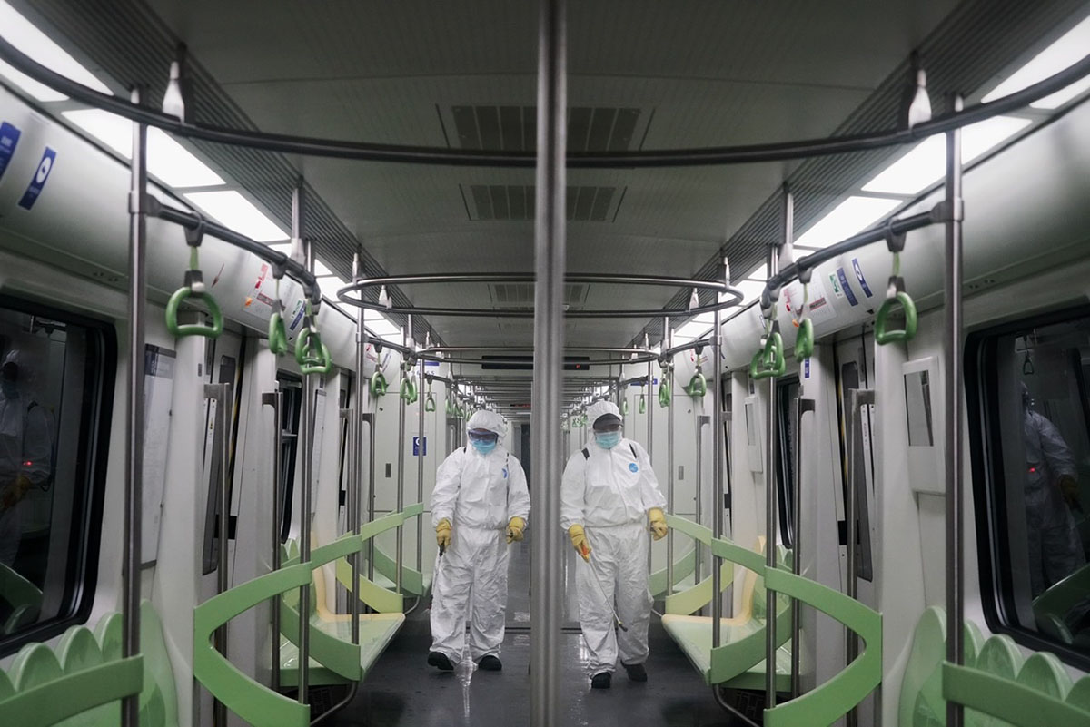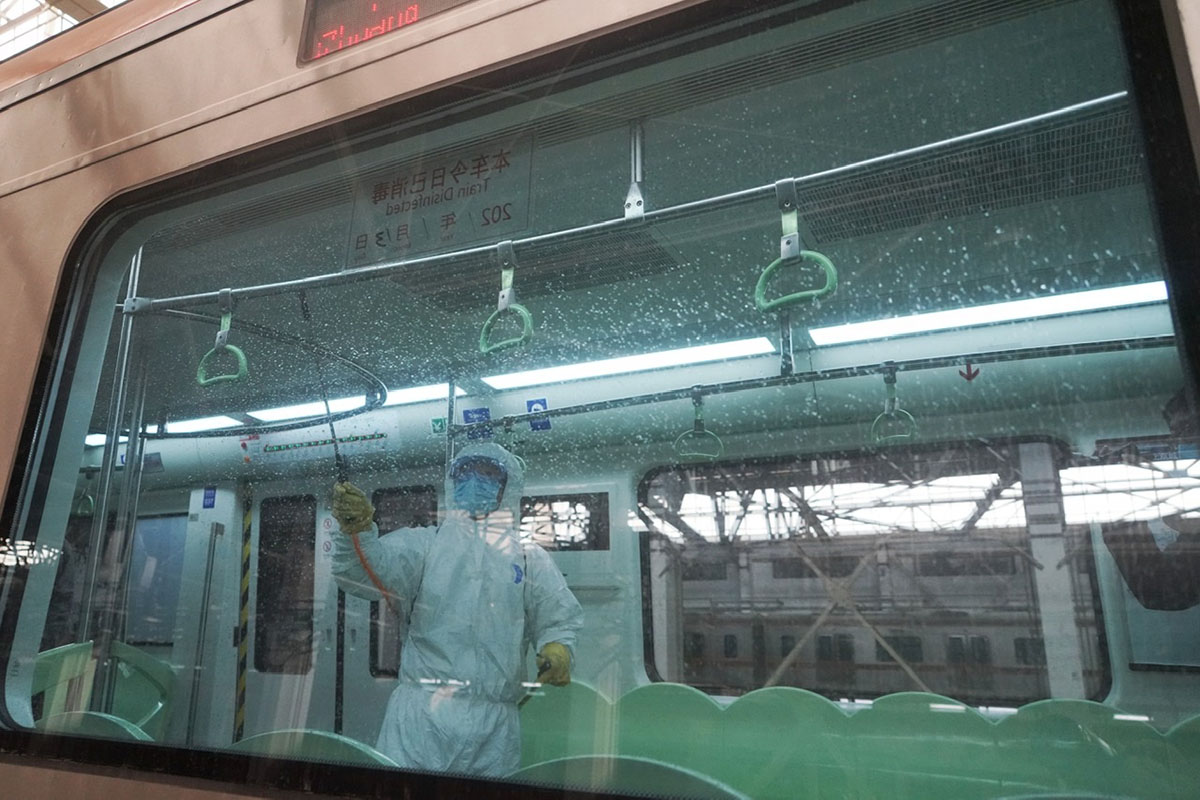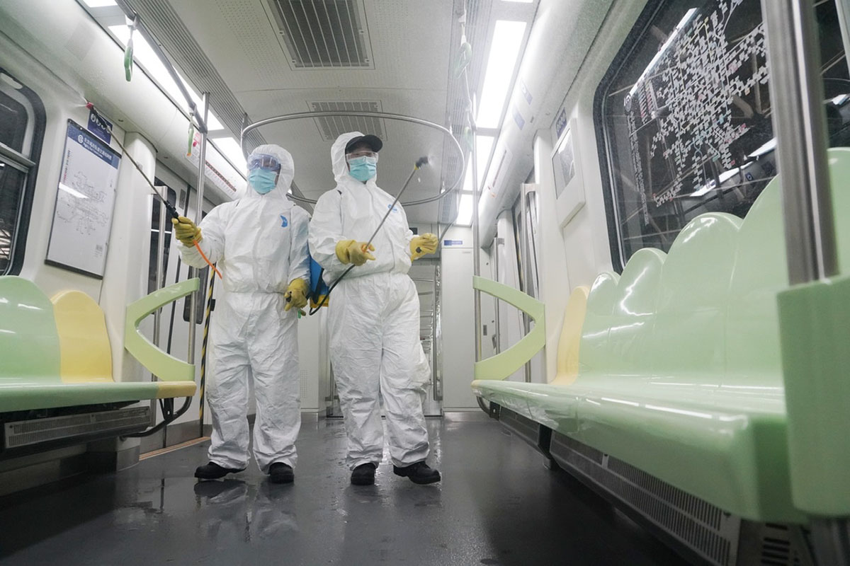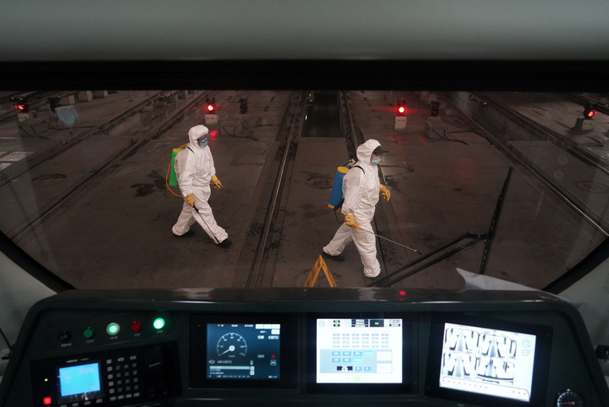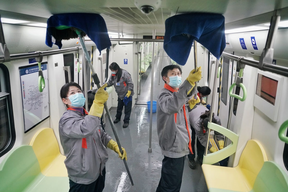 针对目前疫情防控工作要求,北京地铁公司严格执行列车出库前5个步骤的彻底消毒,在列车折返作业时进行喷洒消毒。