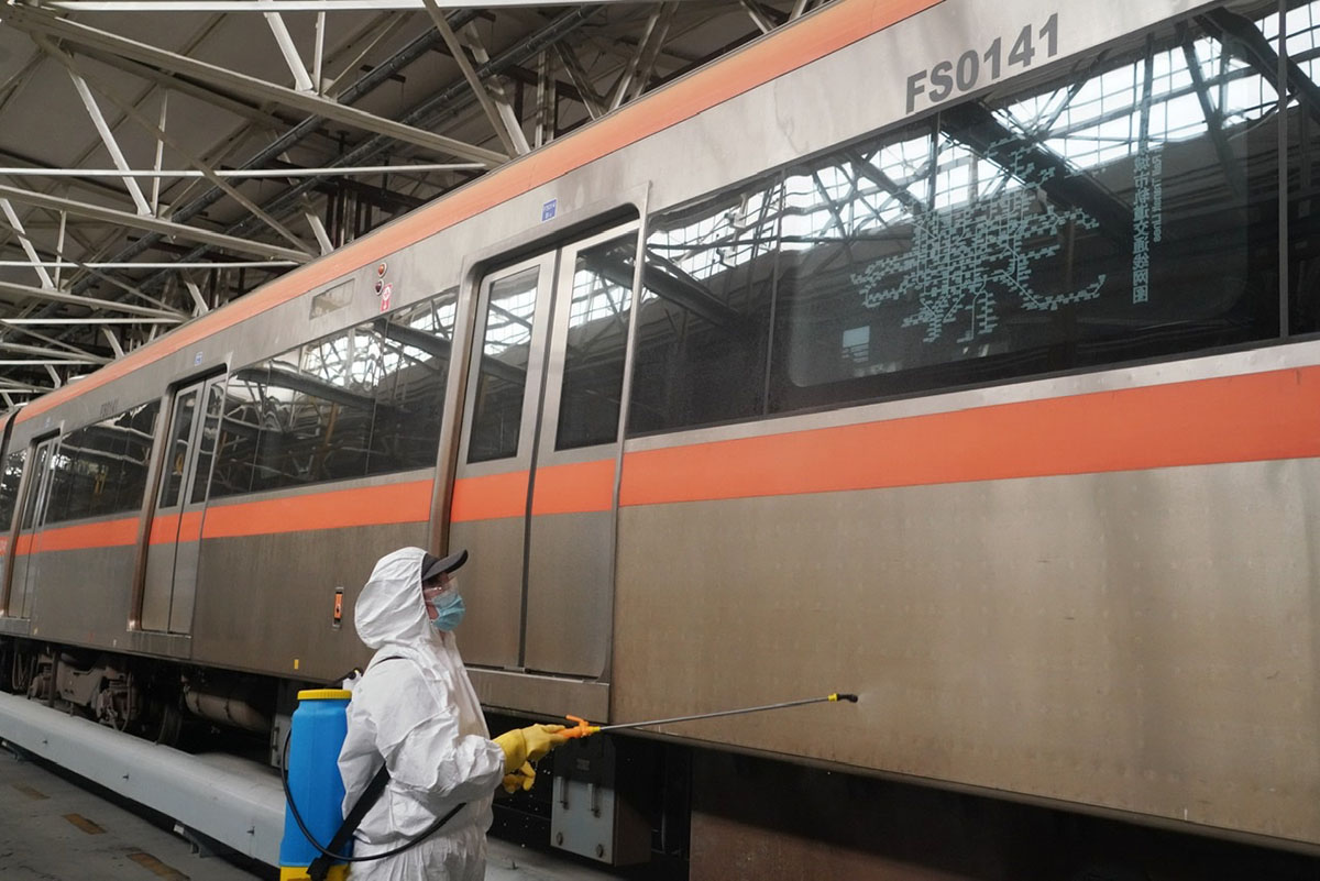 对折返线中途不回库列车的车门、扶手、立杆等乘客频繁接触部位进行擦拭消毒。列车通风滤网每日进行喷洒消毒。