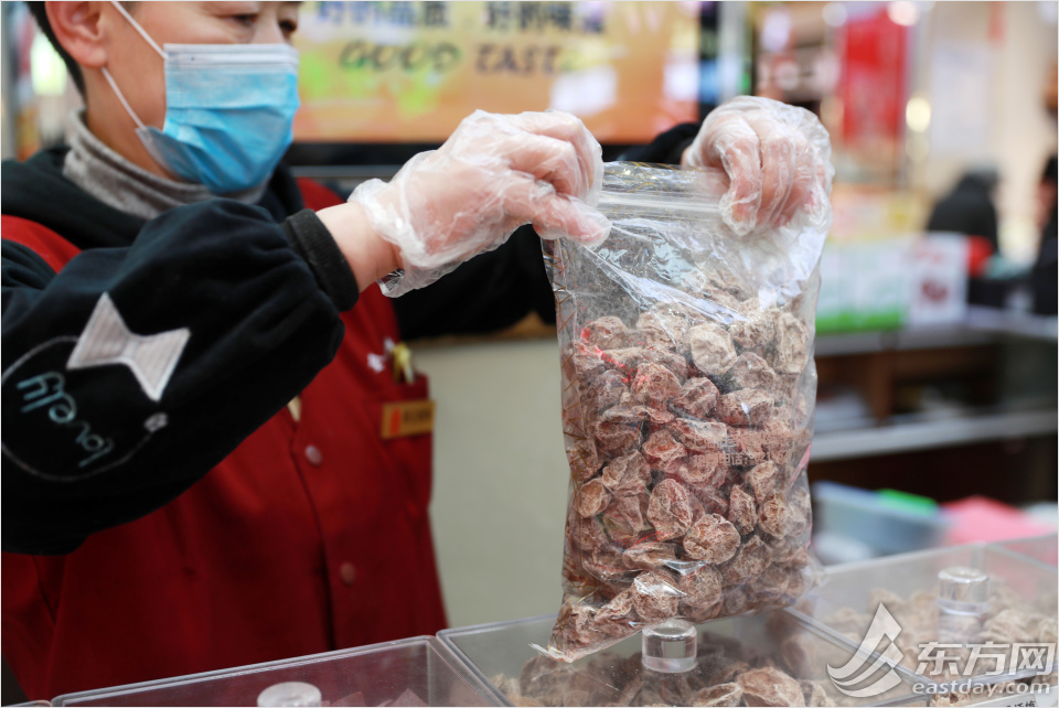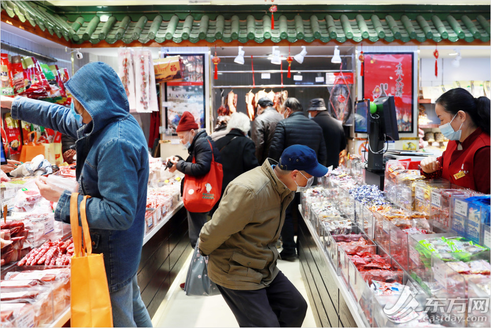 位于淮海路的上海全国土特产食品商场,早上九点刚开门就迎来了排队盛况。各式酱菜酱料、腊肉火腿、糕点零食,琳琅满目。据值班长介绍,过年卖得最好的依旧是辣酱、腊肉、八宝饭等传统食品,瓜子蜜饯等零食也是在家请客必不可少的美食。