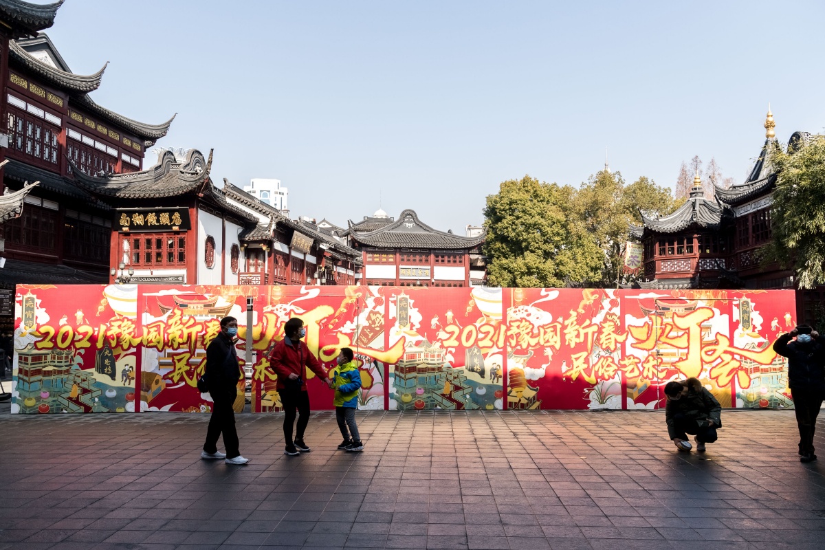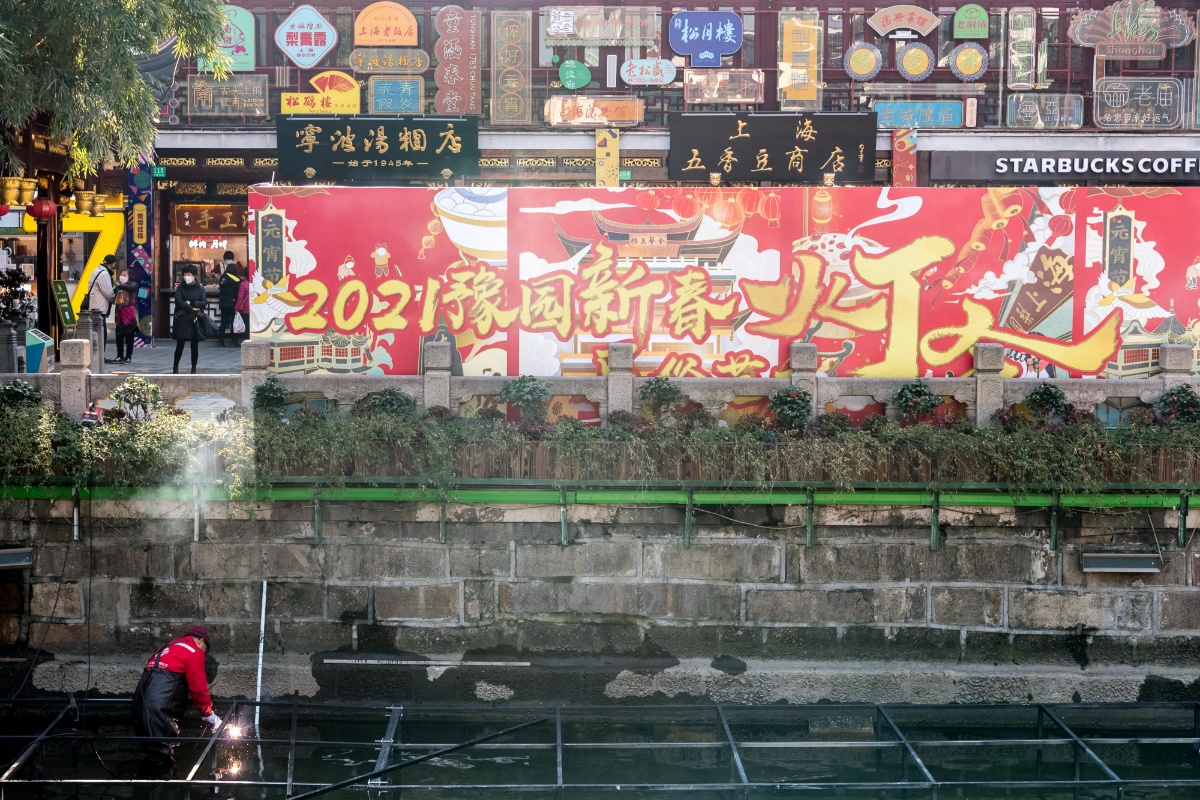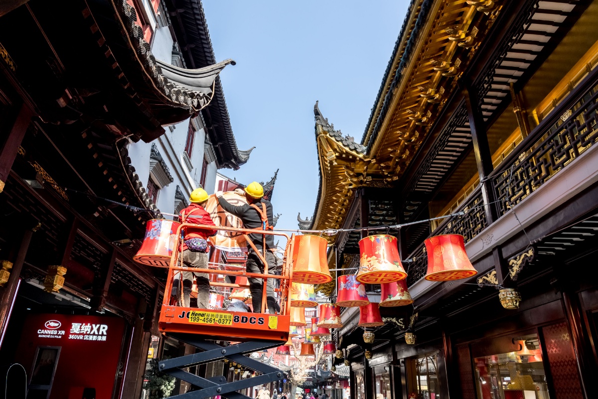 2021上海豫园新春灯会开始搭建 红色元素凸显其中