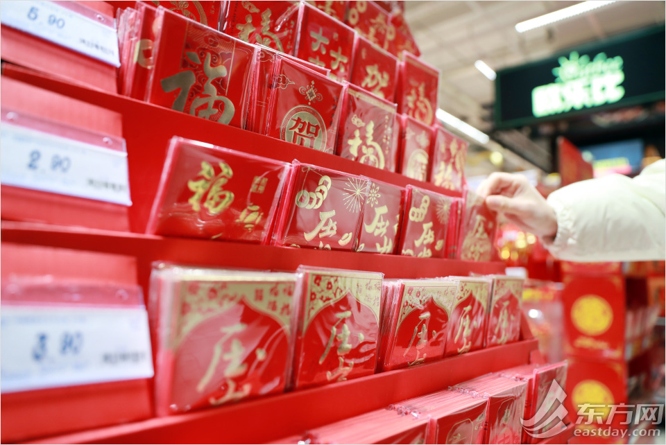 过年给压岁钱是中国人的习俗,货架上一叠叠的红包卖得很快。