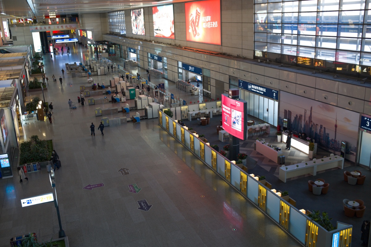 2021年1月28日,上海,2021年春运大幕拉起。上海虹桥火车站出发候车大厅一改往昔人潮涌动的热闹,变得空空荡荡,大家原地过年成风尚。