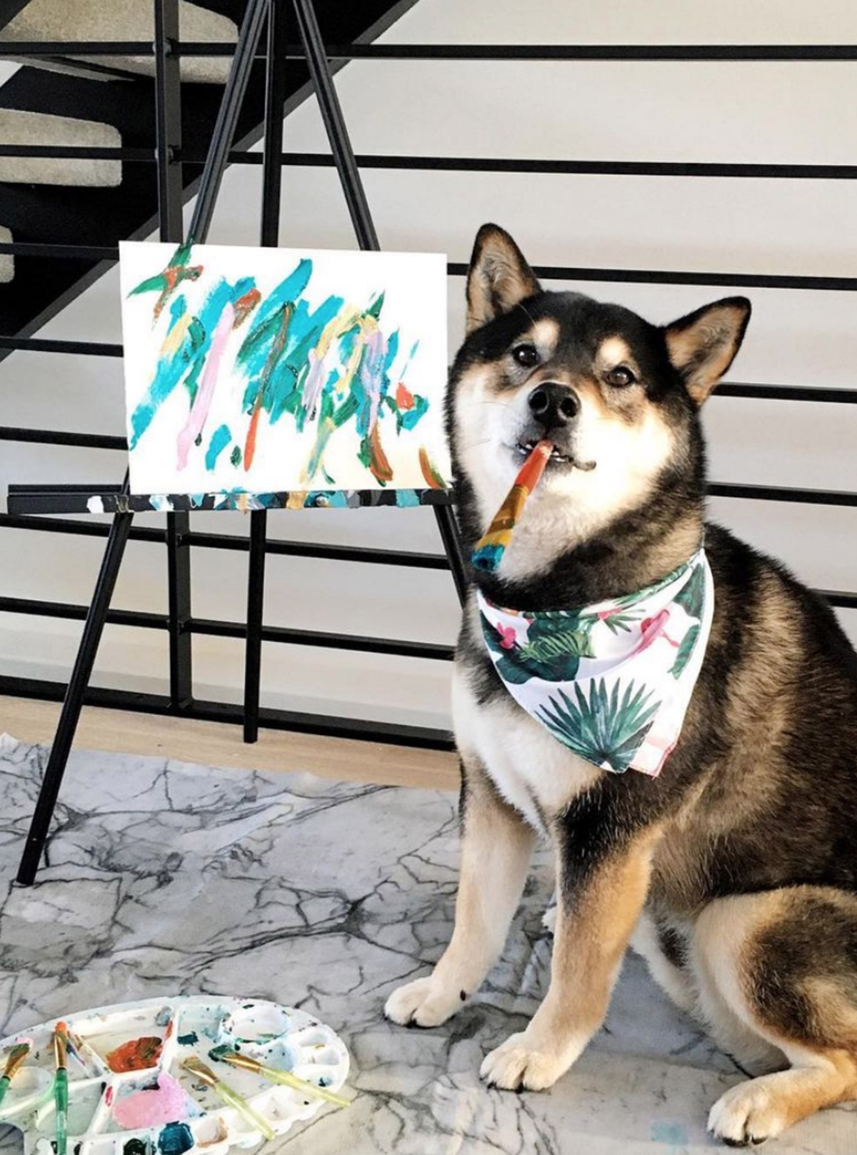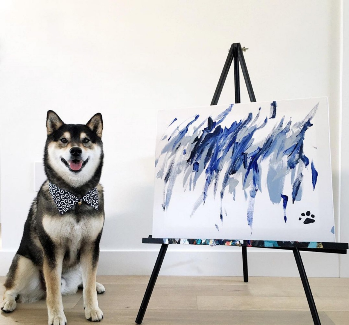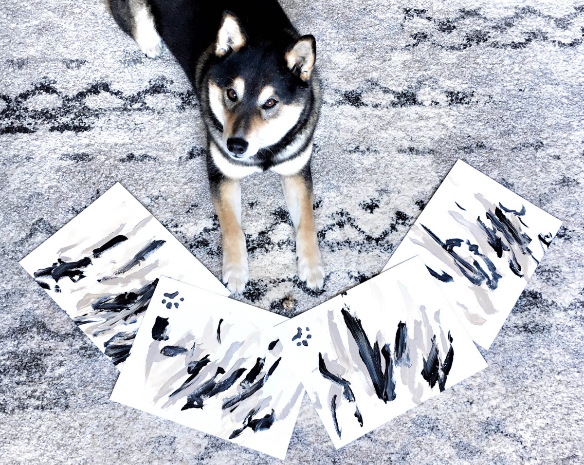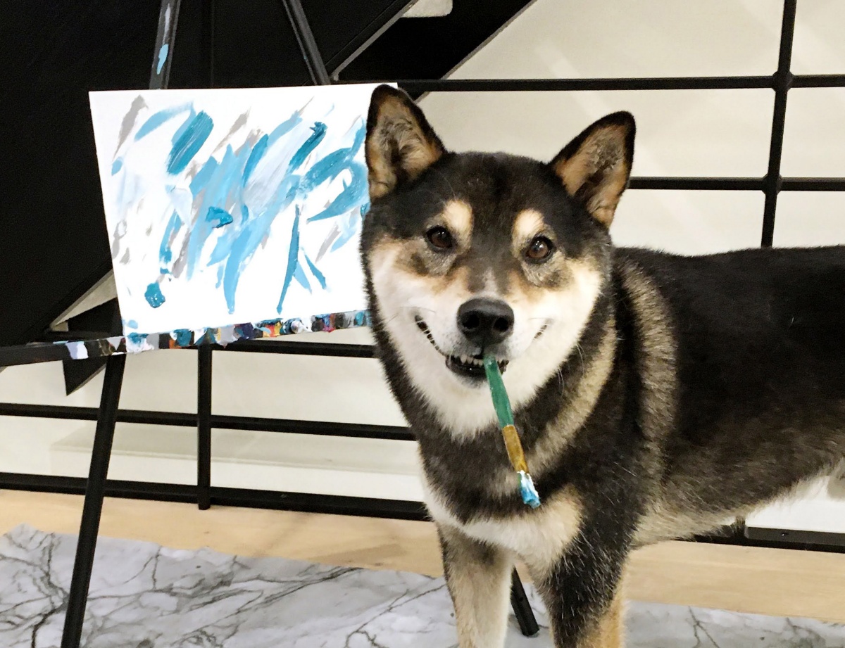 来自加拿大阿尔伯塔省的柴犬亨特有颜又有才,它从2017年起,在主人Denise Lo.的启发下开始接触油画,从此变身抽象小画家,并有了自己的系列作品。Denise把Hunter的作品放到网上卖,迄今卖出了288幅画作,每幅售价46.91英镑,每件作品的背面还都印上了Hunter自己独一无二的爪印。