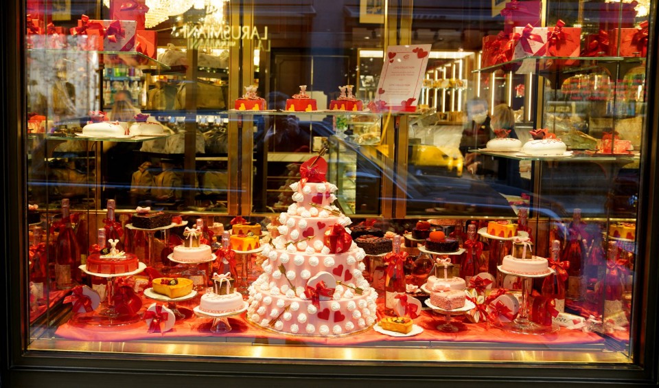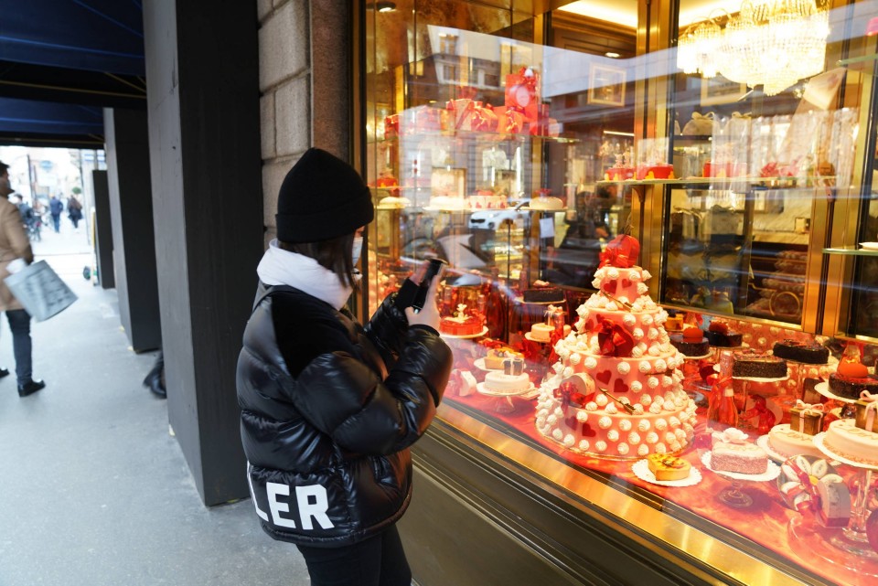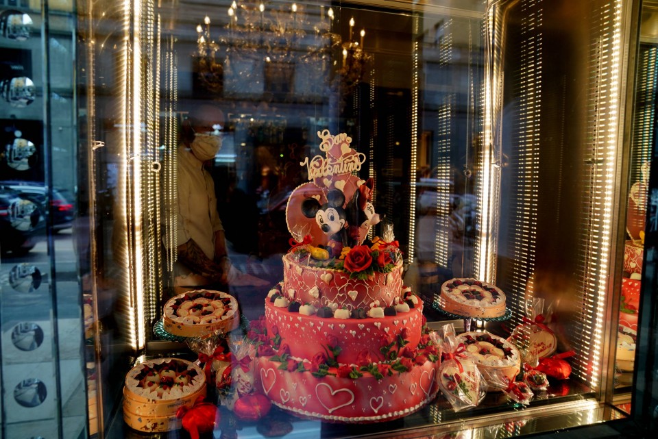 当地时间2021年2月12日,意大利米兰,一家名叫Sant 'Ambroeus的餐厅摆放精美情人节主题的装饰品。