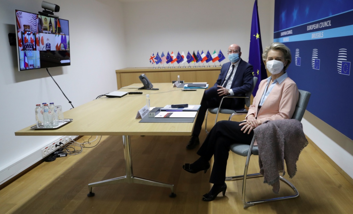 当地时间2021年2月19日,比利时布鲁塞尔,七国集团领导人召开视频会议,欧盟委员会主席冯德莱恩和欧盟理事会主席查尔斯-米歇尔出席视频会议。