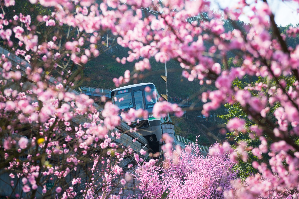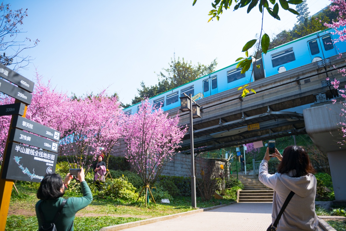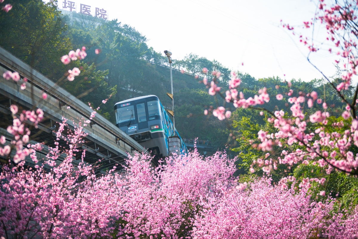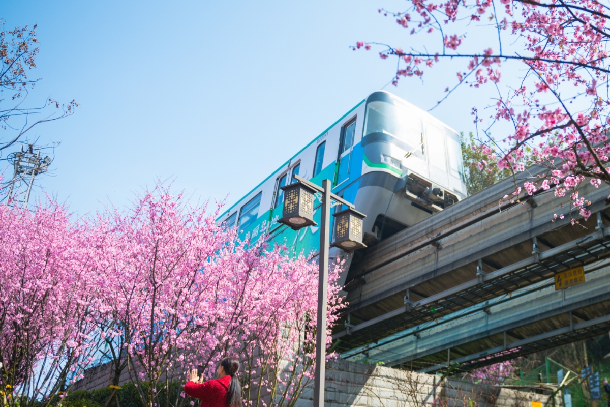 2021年2月19日,重庆佛图关公园,单轨列车穿行在花海中。
