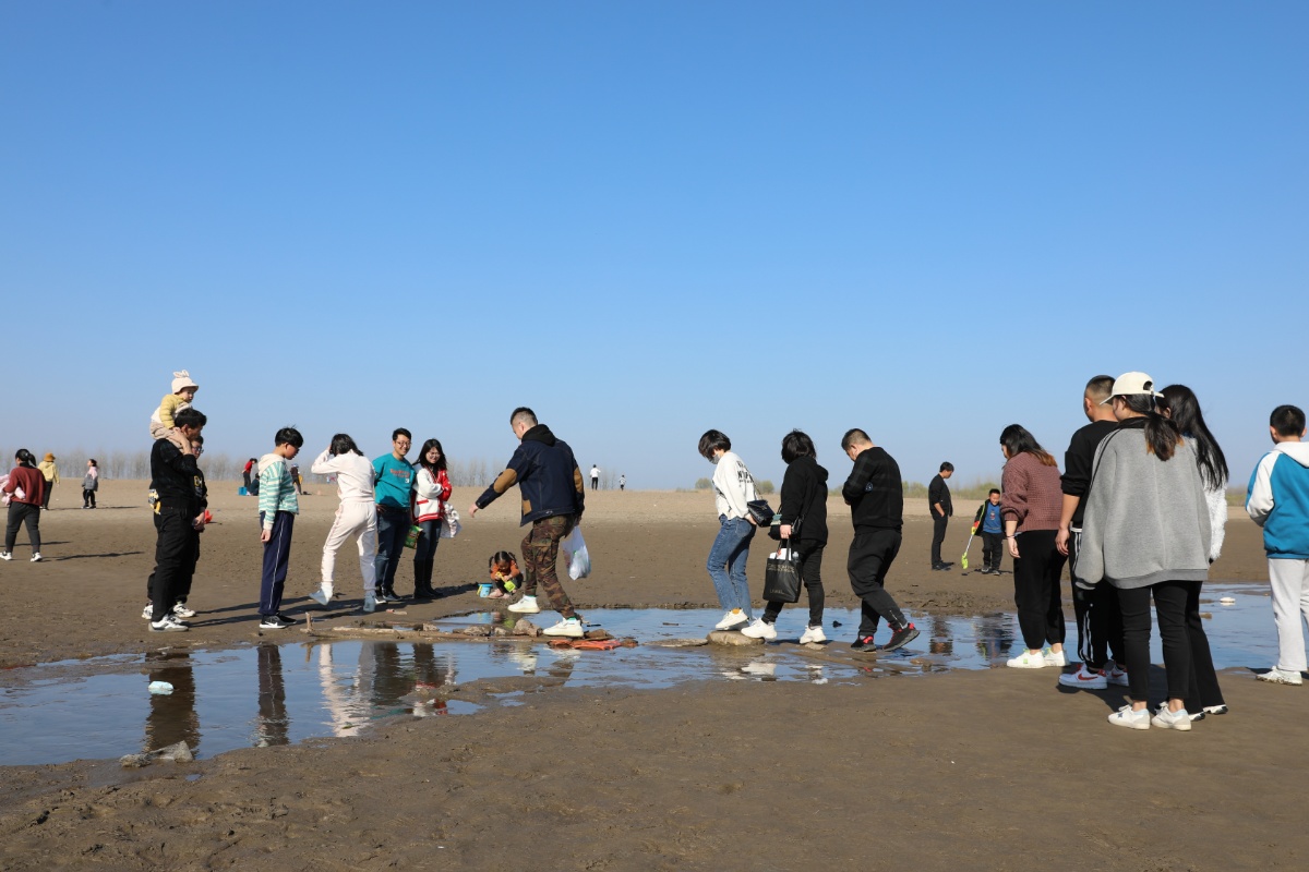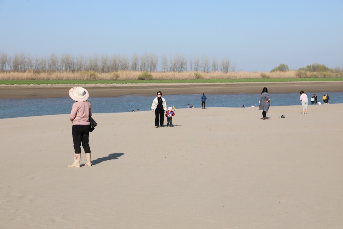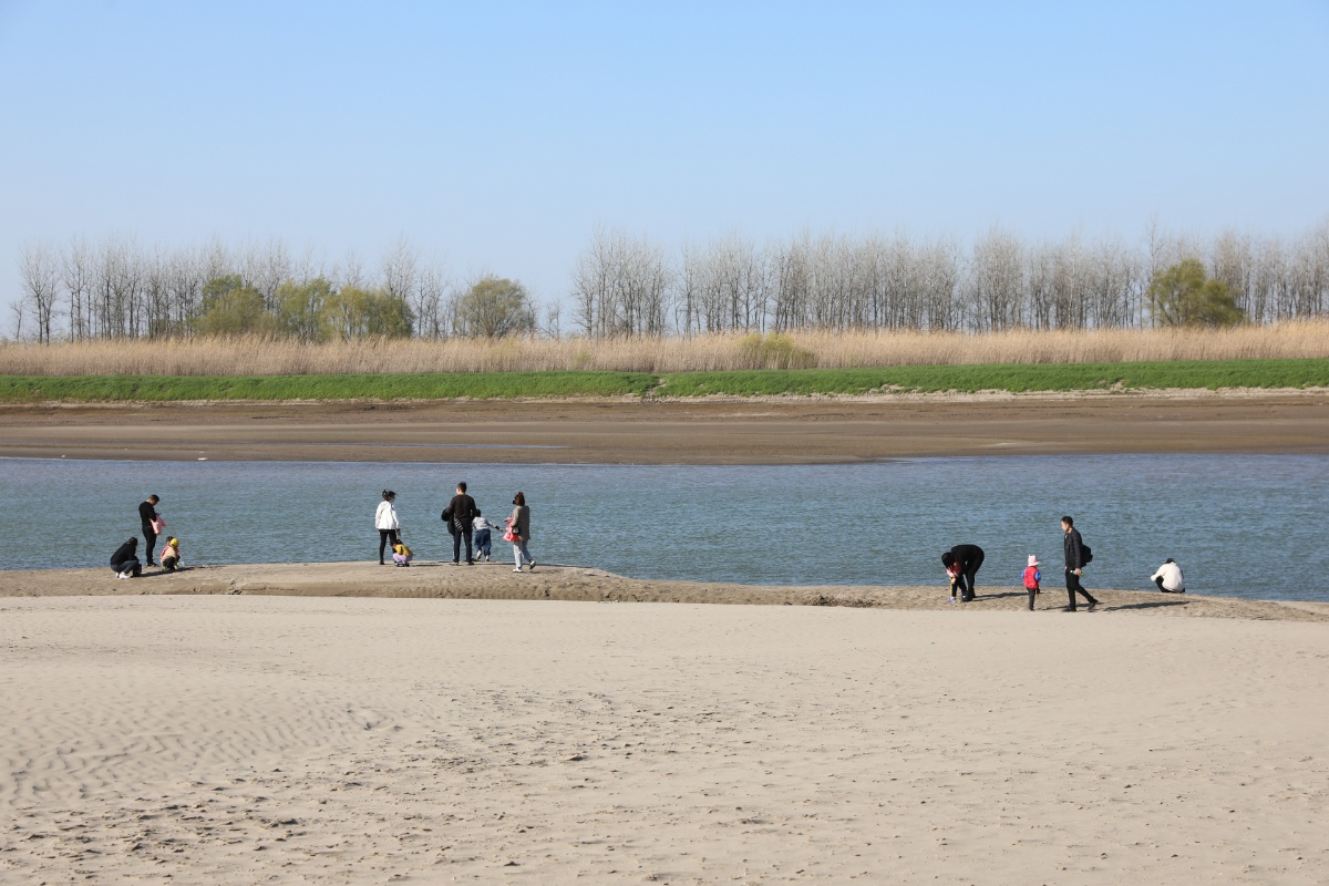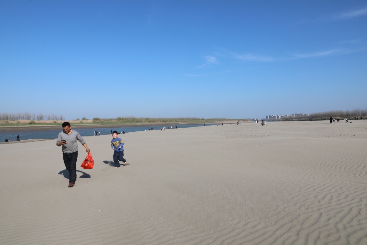 2021年2月20日,安徽池州,池州长江大桥下游几百米处出现大片沙滩,游人络绎不绝如同赶“大集”。