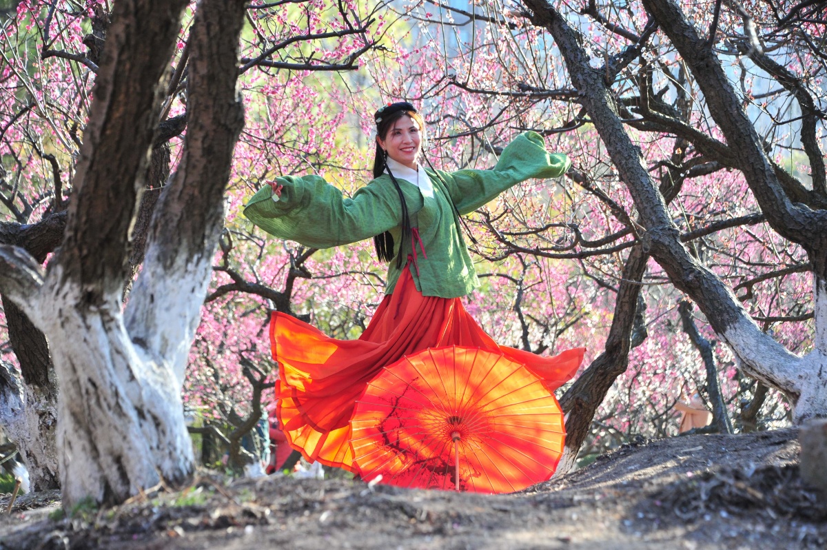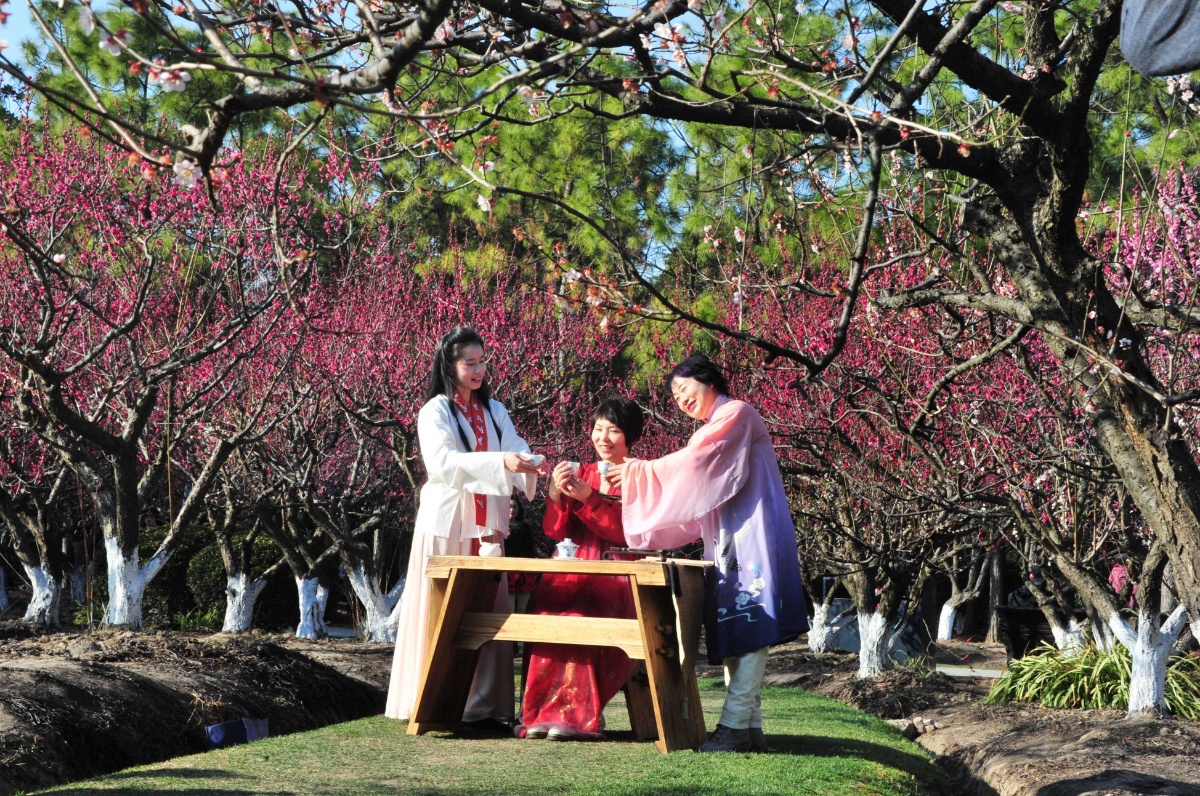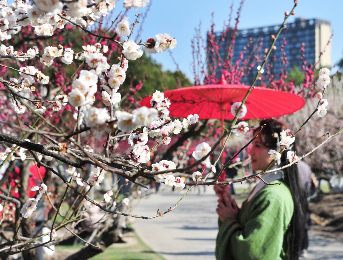 2021年2月20日,随着申城天气的连日回暖,世纪公园的梅园暗香浮动,梅花也进入最佳观赏期,宫粉、江梅、绿萼、玉蝶等品种的梅花争相竟艳枝头,形成了一片烂漫多彩的花海,前来赏梅的游客络绎不绝。图为女孩们穿汉服在梅林间留影成了两单。