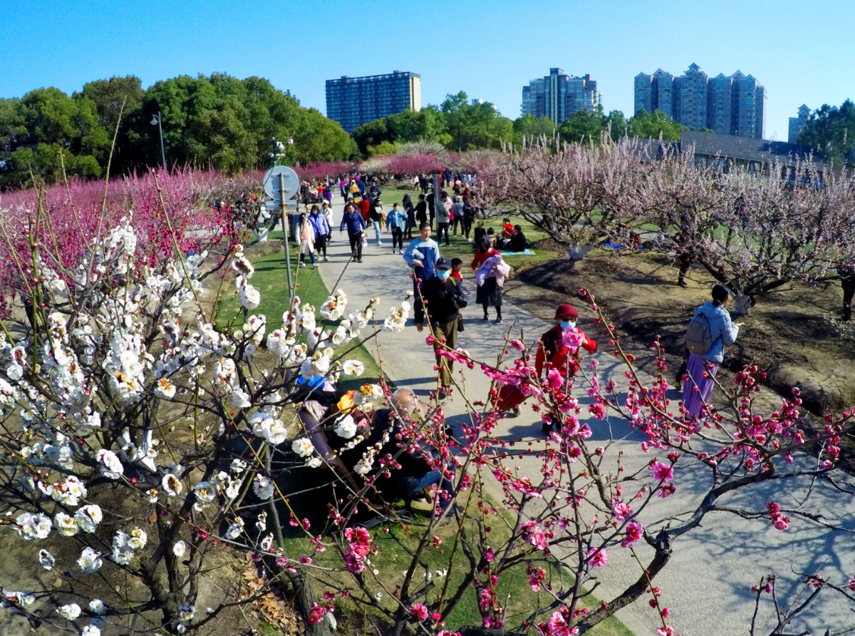 2021年2月20日,随着申城天气的连日回暖,世纪公园的梅园暗香浮动,梅花也进入最佳观赏期,宫粉、江梅、绿萼、玉蝶等品种的梅花争相竟艳枝头,形成了一片烂漫多彩的花海,前来赏梅的游客络绎不绝。