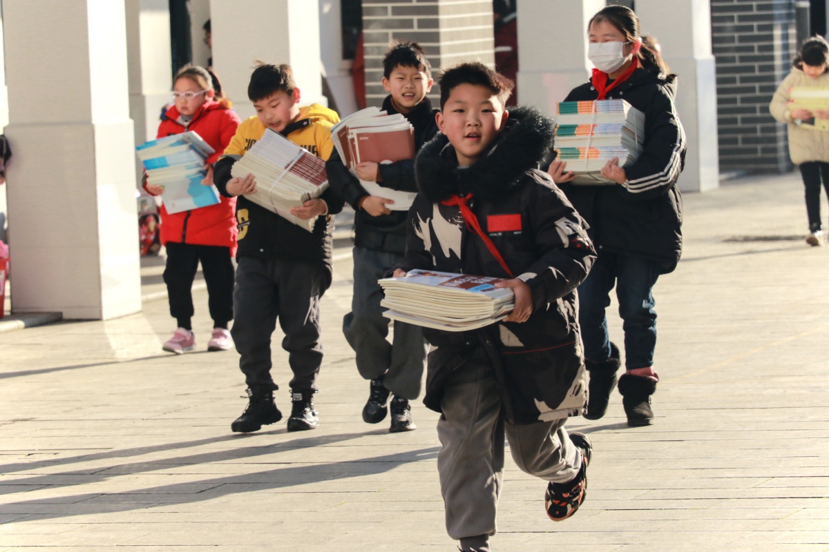2021年2月21日,江苏淮安,纪家楼小学同学正在搬运新教材。当天,江苏中小学学生到校报到,2月22日江苏中小学将正式开学。