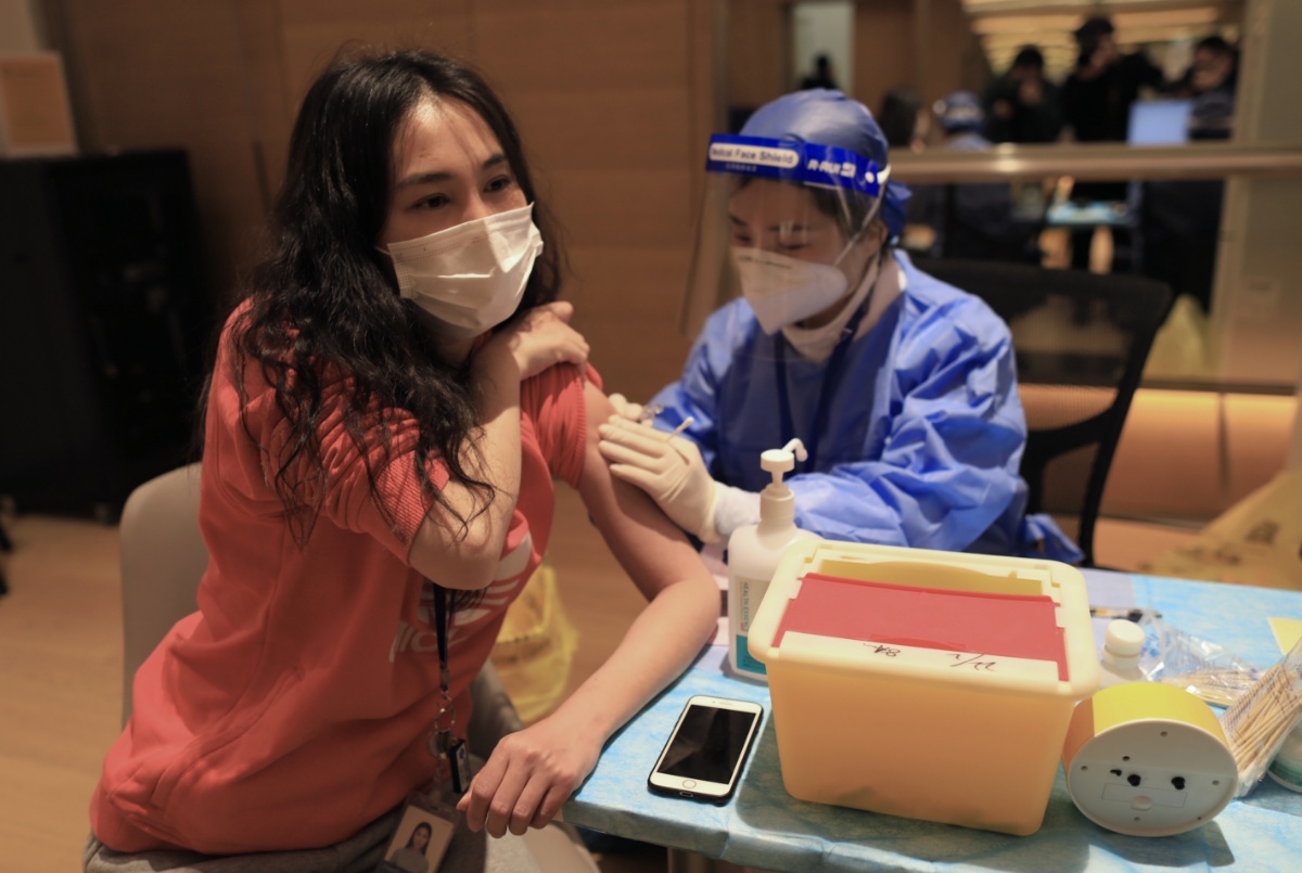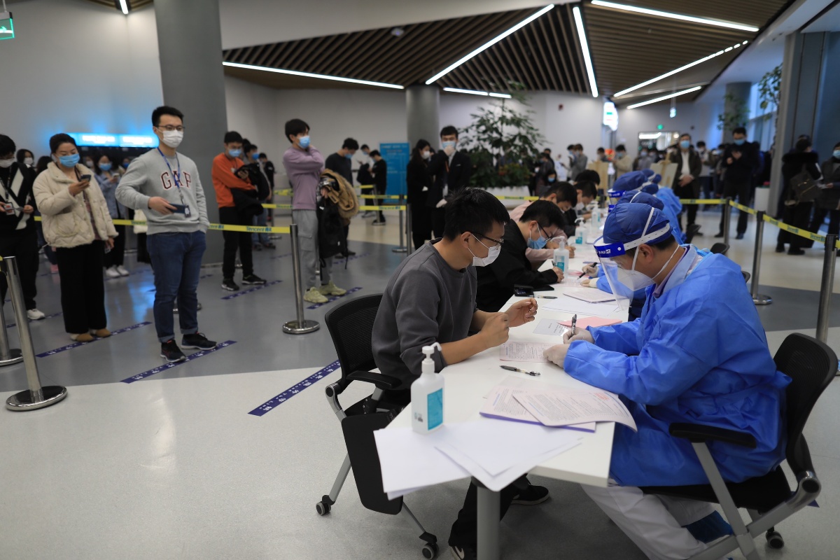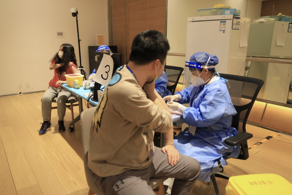 2021年2月22日,北京,腾讯北京总部大楼内,员工有序接种新冠疫苗第一剂。
