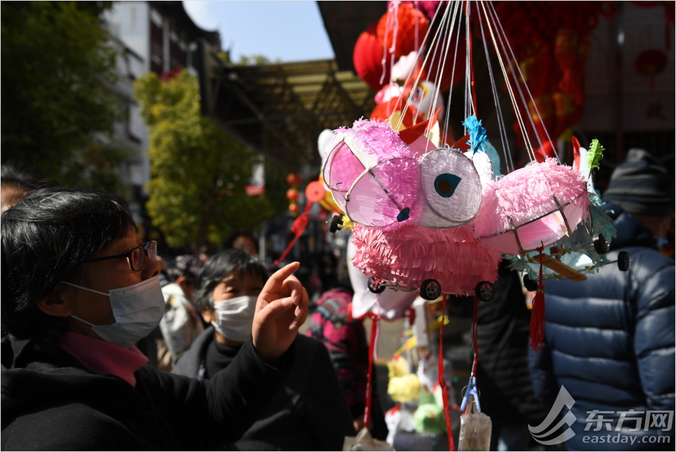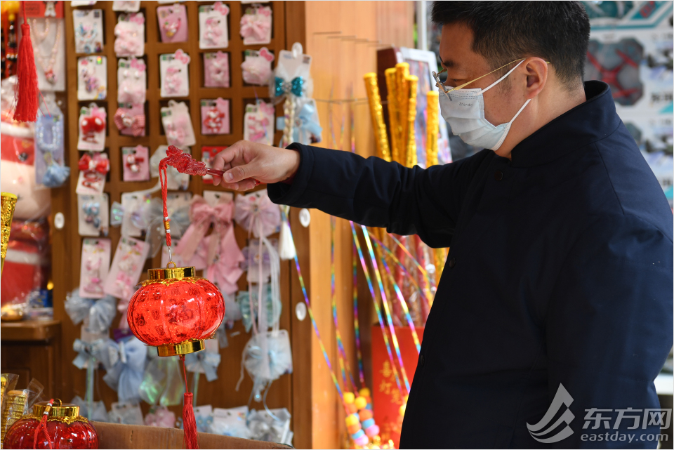造型各异的元宵花灯将店铺装扮得年味十足。