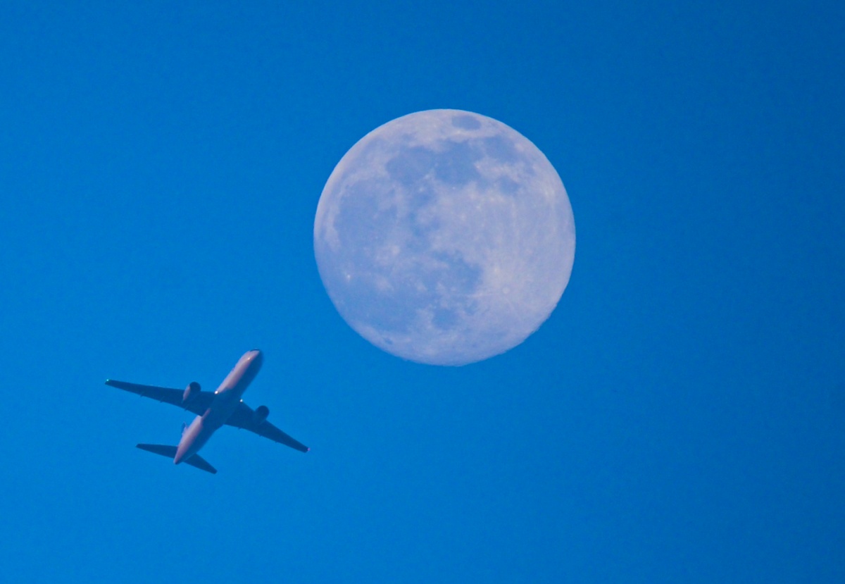 2021年2月26日,正月十五元宵节,大连市上空,一架客机在圆月附近飞行,恰似飞机逐月。