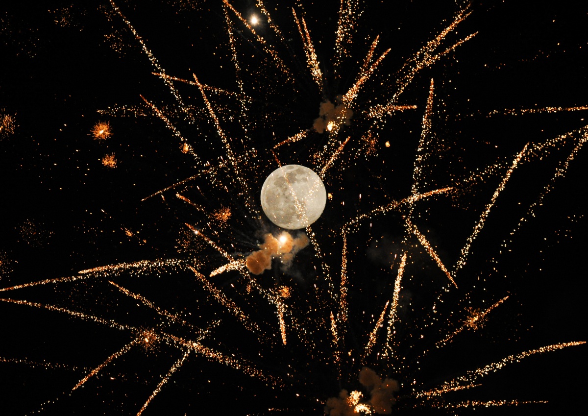 2021年2月26日,辽宁大连,正月十五元宵节,大连市上空,绚丽的礼花映圆月相互映衬。