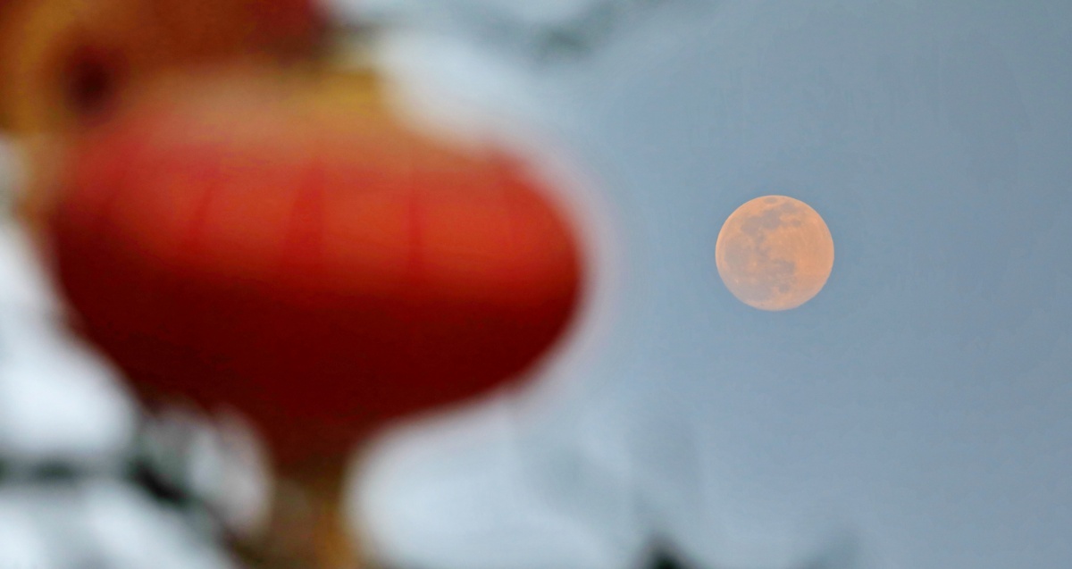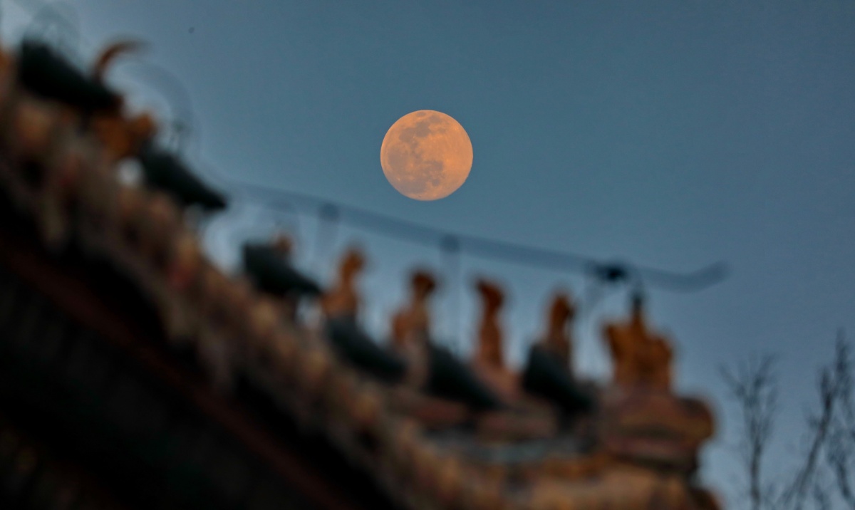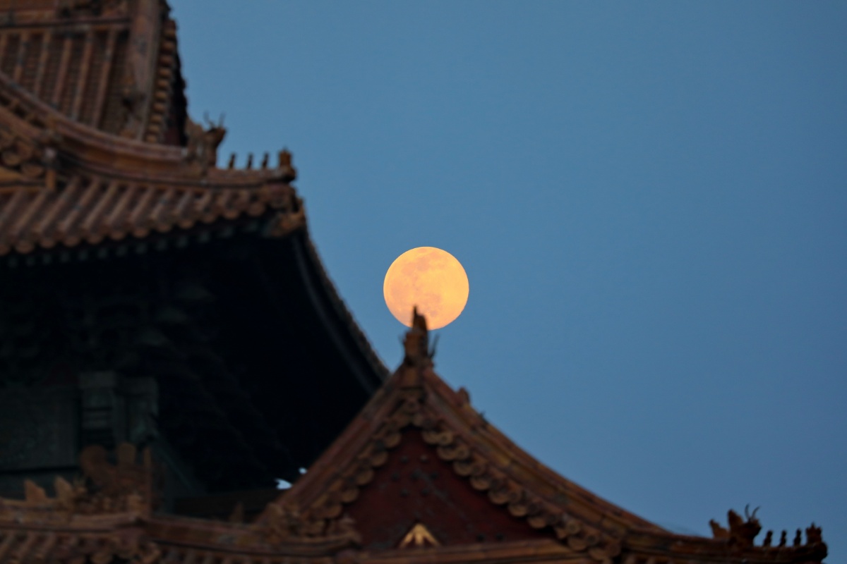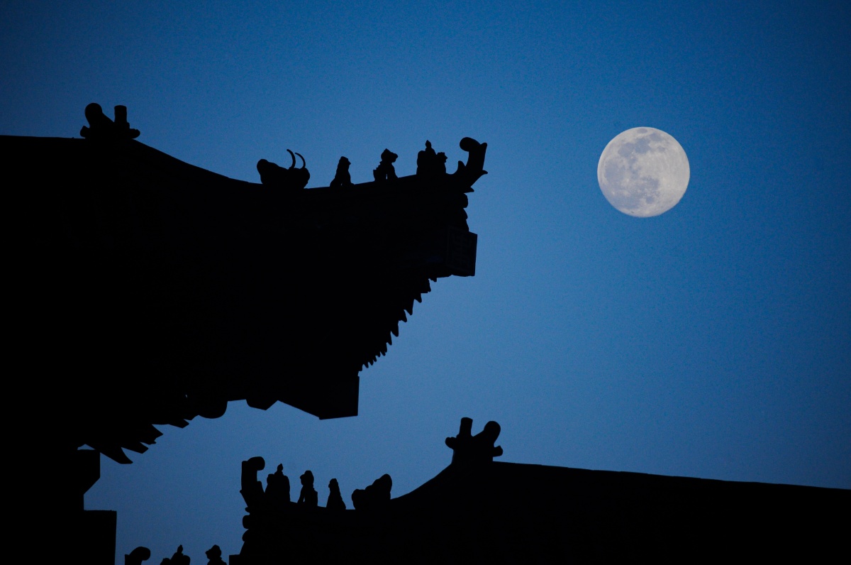 2021年2月26日,正月十五元宵节,大连市甘井子区一处古建筑的的翘角与圆月相互对应,恰似犀牛望月。