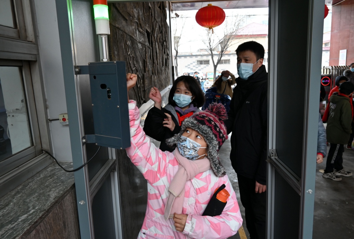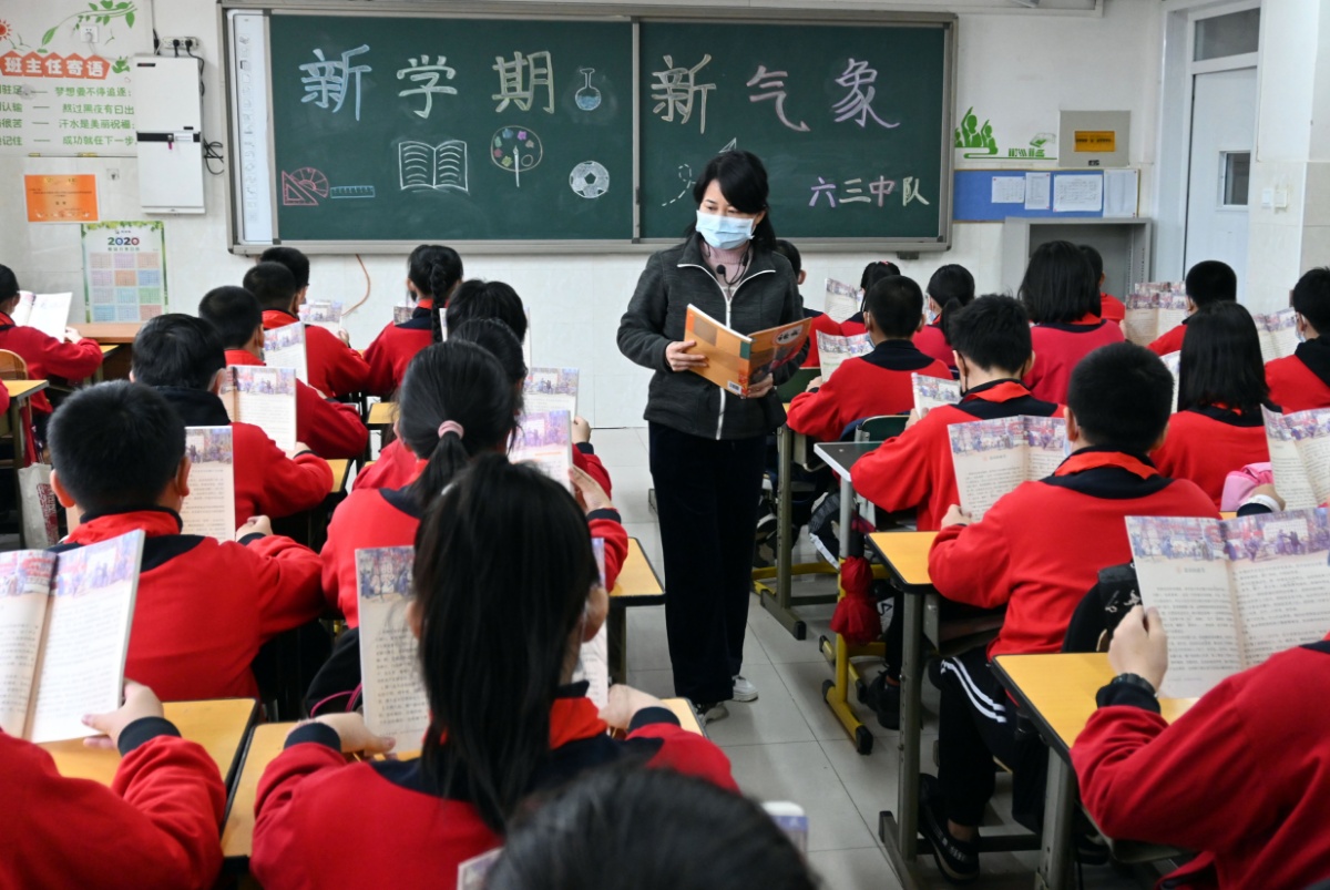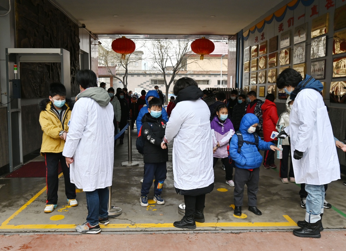 2021年3月1日下午,河北石家庄翟营大街小学操场上的小学生。当日,在严格落实疫情防控要求的前提下,该市小学全面开学复课。