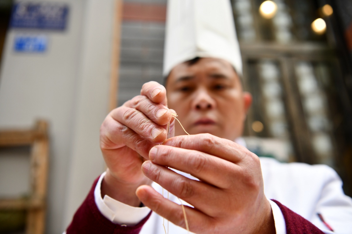 成都大刀金丝面传人用面条穿针 68元一碗限量供应