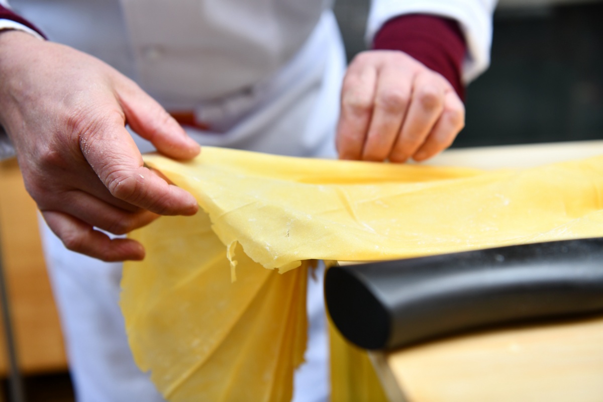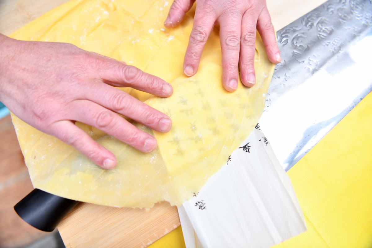他制作的金丝面,过程当中需要经过“五推五压五擀”等数十道工序,擀出面皮薄如纸张,最后再用58厘米长的大刀切成丝,细到可以将3至5根细面丝穿过针眼。