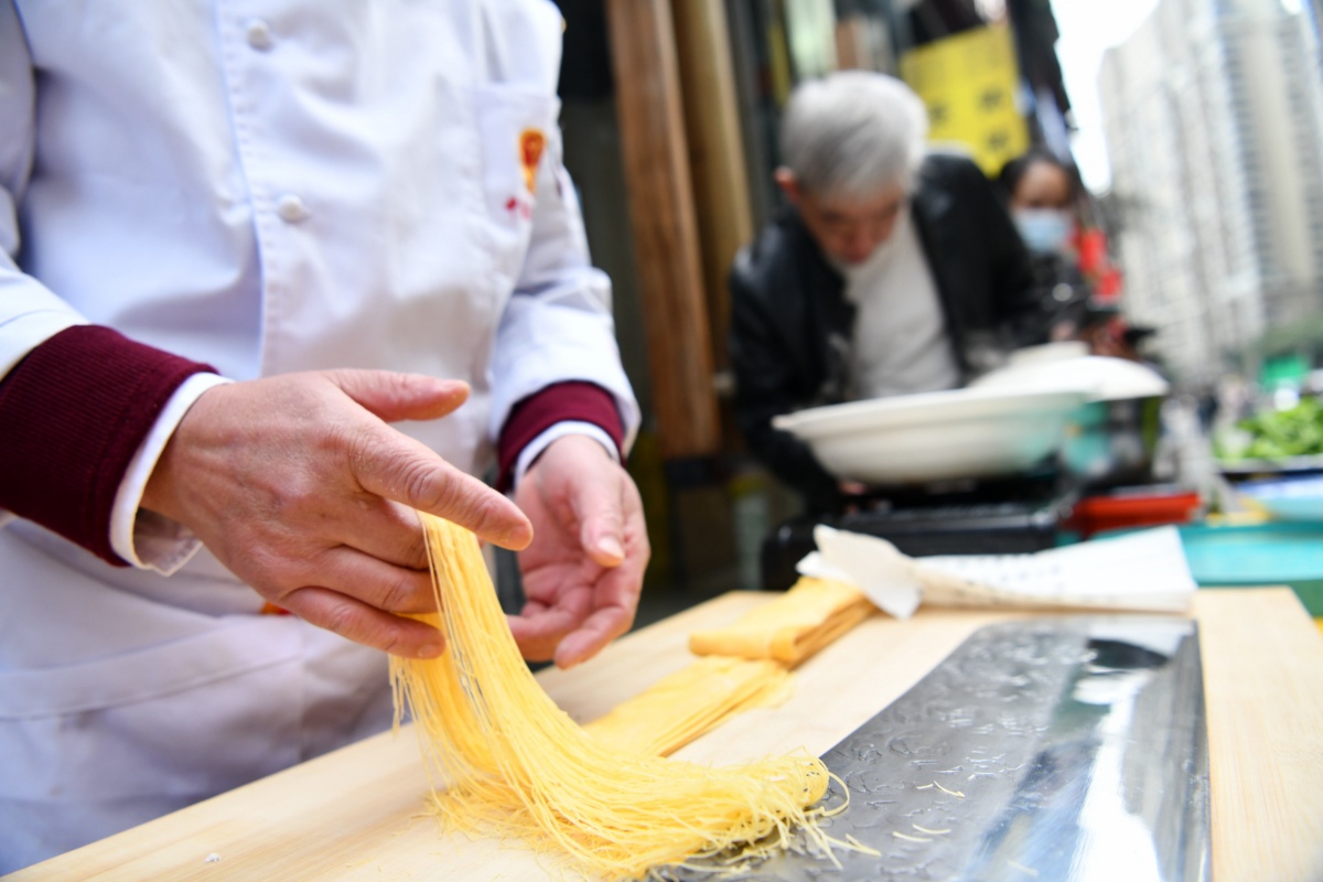 2021年3月2日,四川成都市一家面馆前,非物质文化遗产大刀金丝面第三代传承人杨永福向市民展示绝技。
