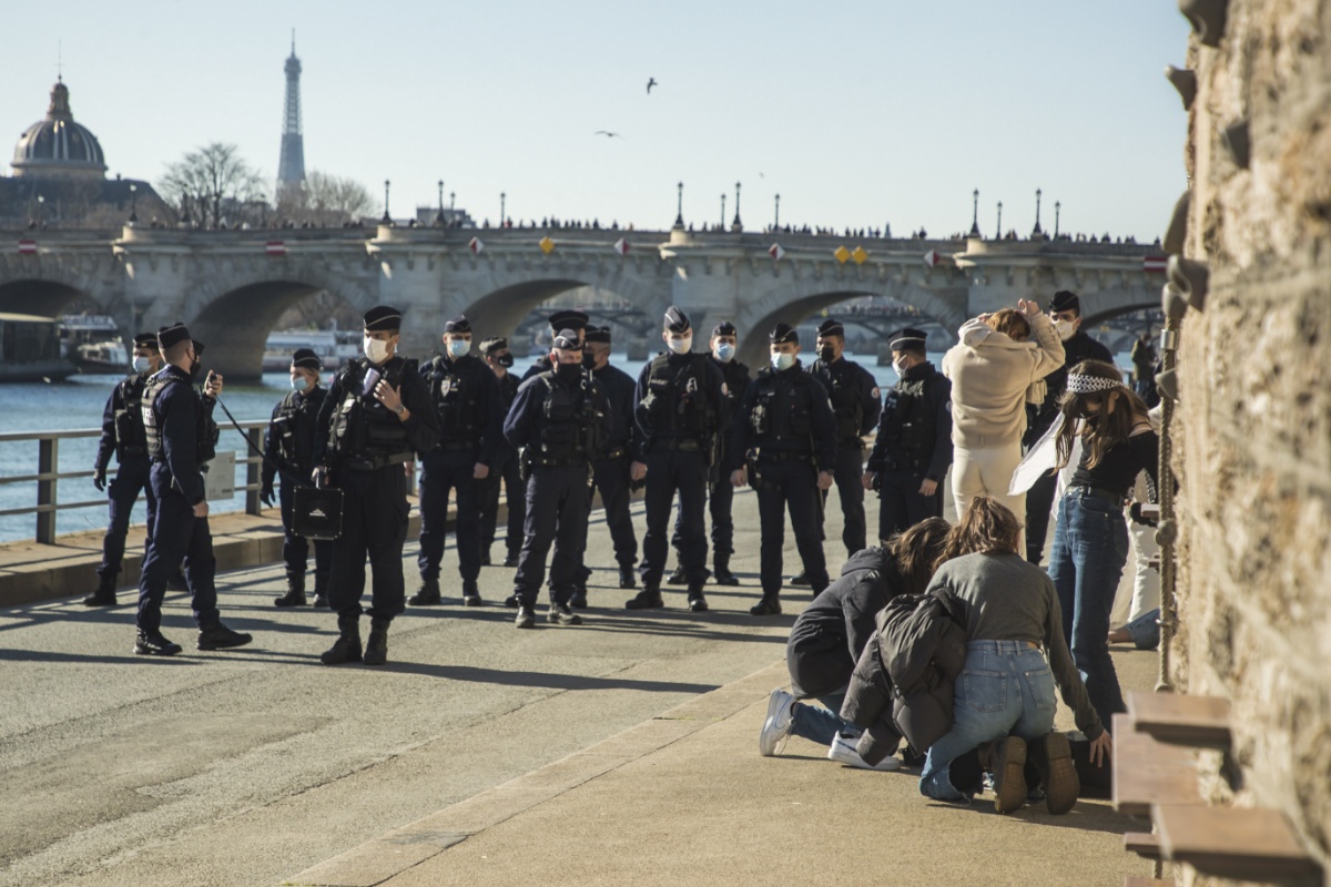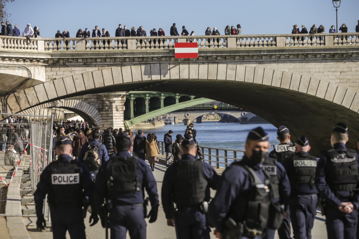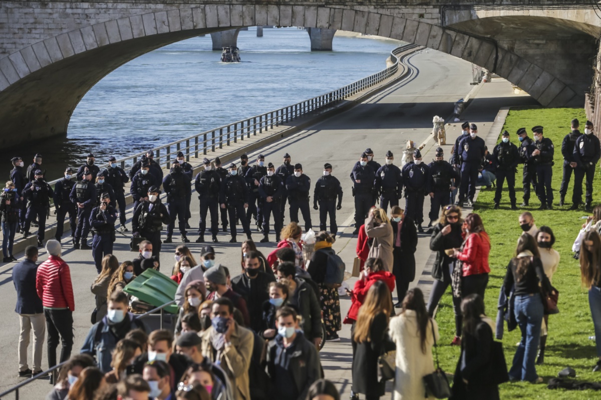 当地时间2021年3月6日,法国巴黎,民众聚集塞纳河畔享受日光浴,警察驱散聚集的人群。