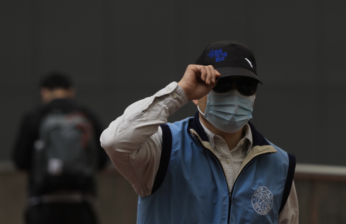 2021年5月6日,北京海淀区,市民行走在风沙中。