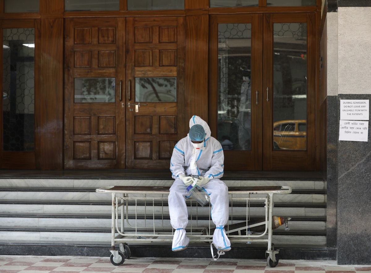 近日,印度医学会(IMA)主席贾亚拉表示,印度共有860多名医生因新冠疫情去世,但第二波疫情之下,不到一个月的时间内就有116名医生去世。当地时间2021年5月7日,印度加尔各答,一名医务工作者坐在移动病床上。