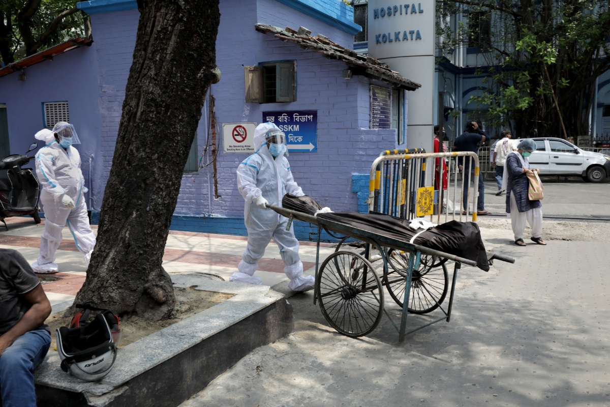 当地时间2021年5月7日,印度加尔各答,医务工作者搬运遗体。