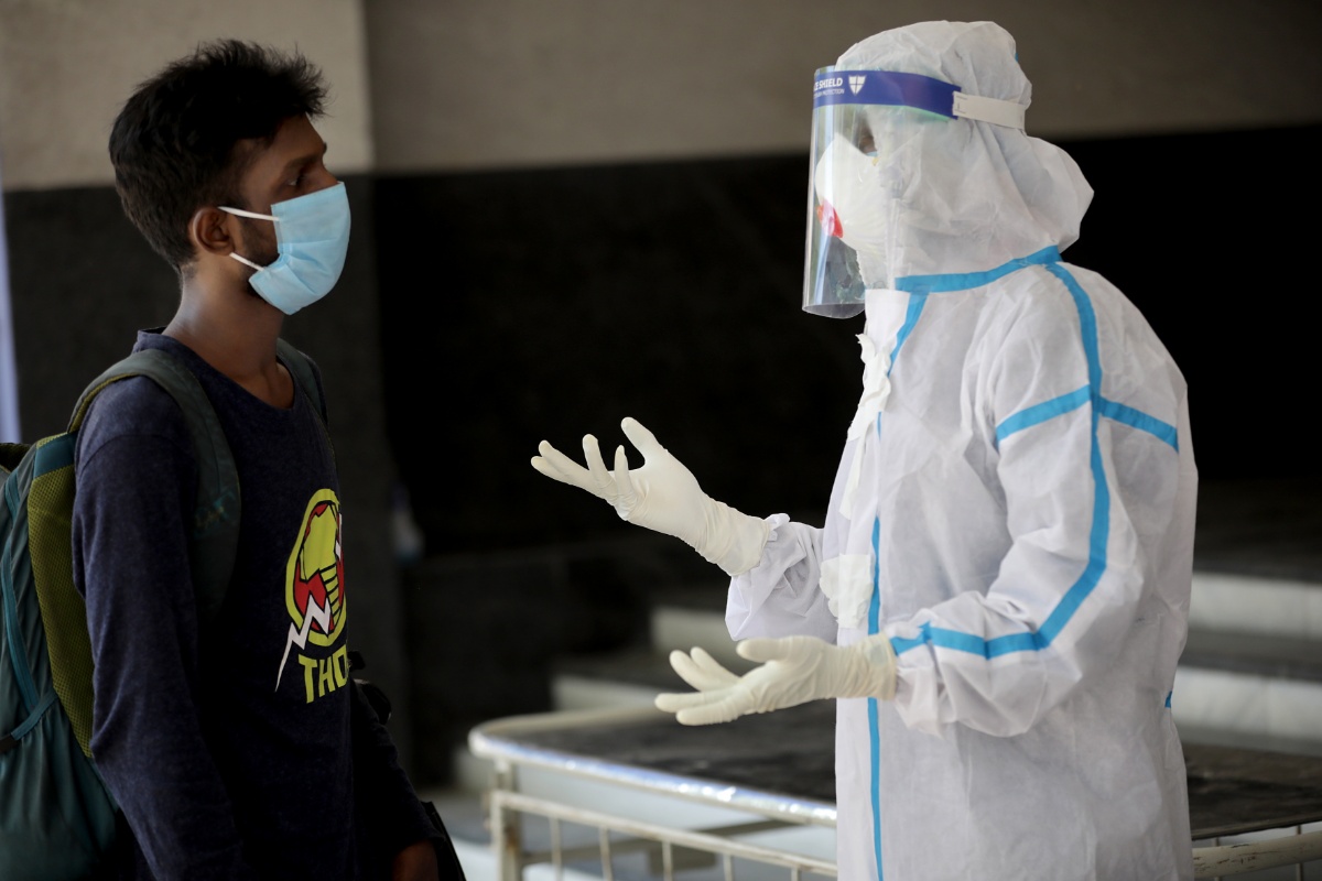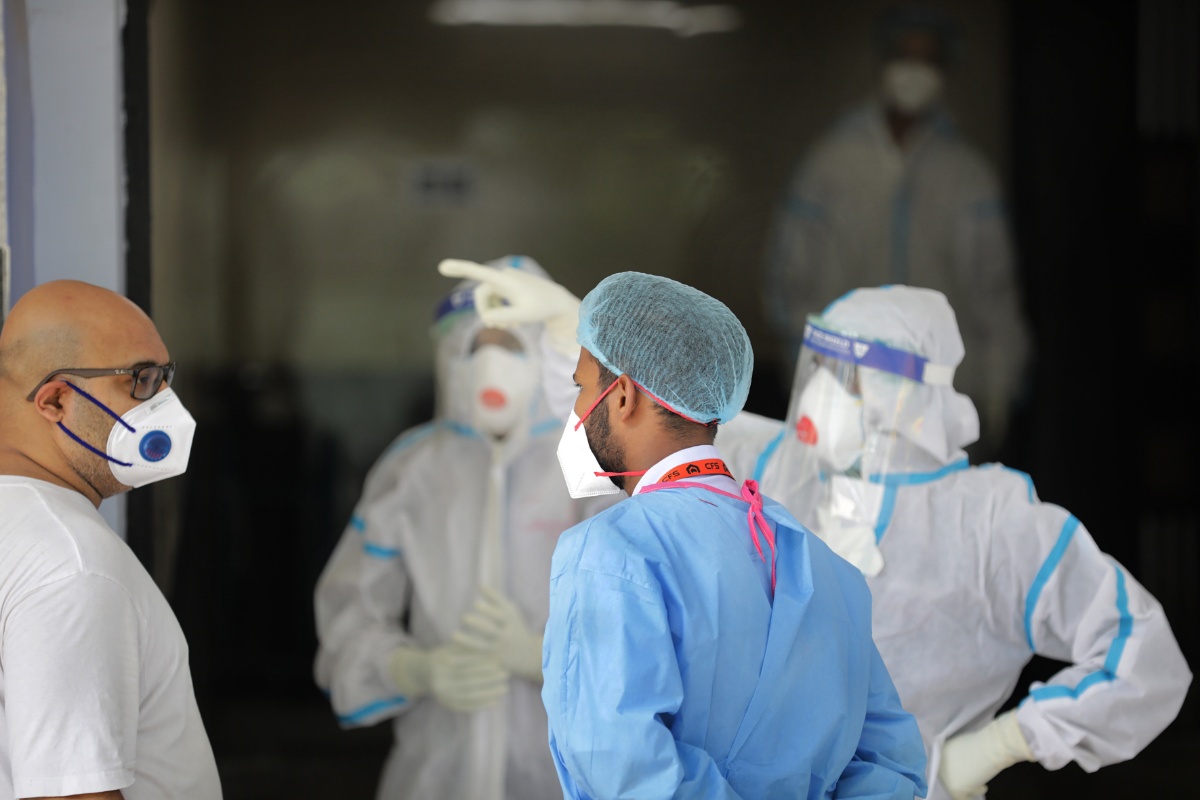 当地时间2021年5月7日,印度加尔各答,医务工作者与病人亲属交谈。