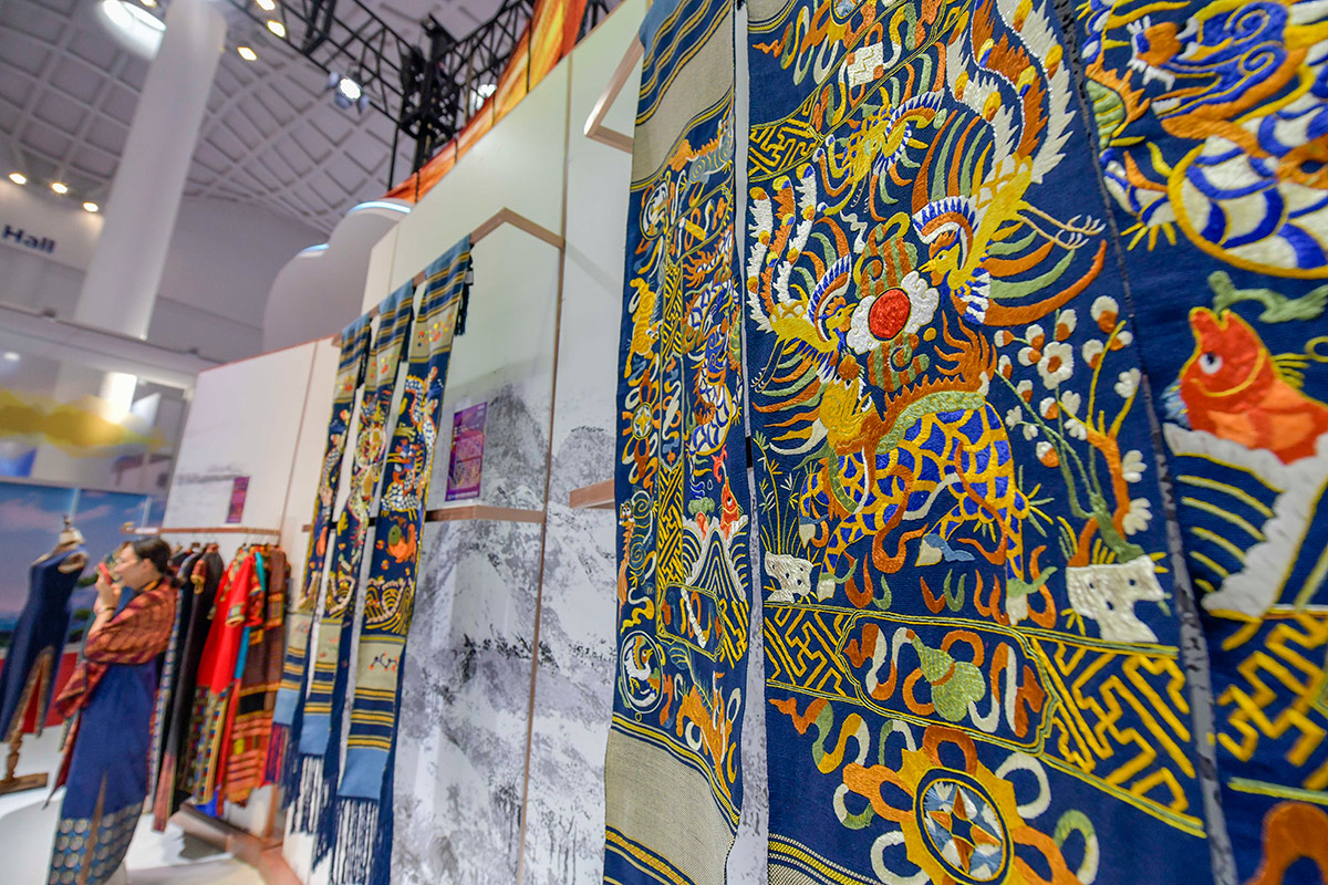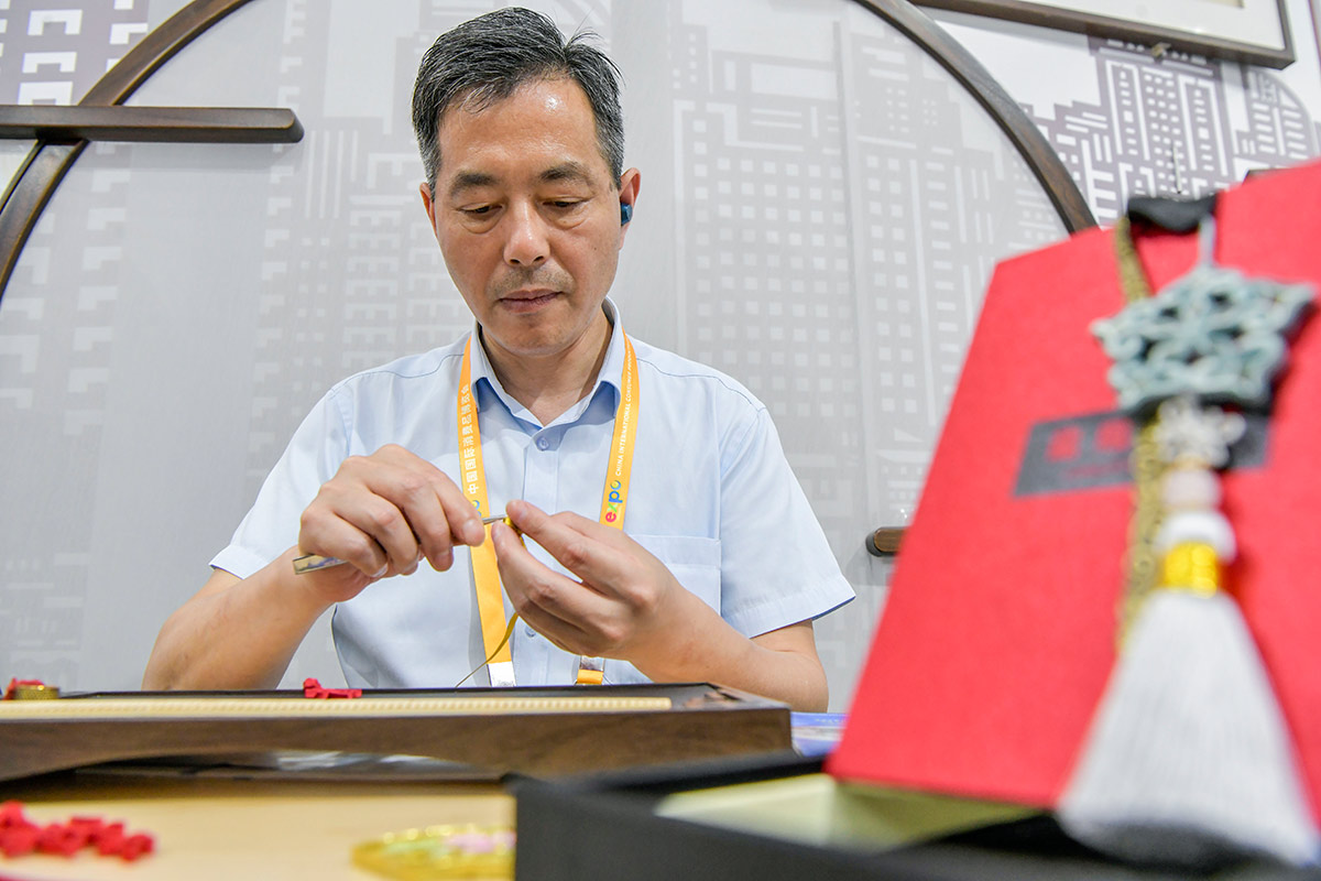 2021年5月8日,中国国际消费品博览会在海南省海口市继续进行。图为龙凤旗袍第四代传承人江满宗现场展示龙凤旗袍盘扣制作。
